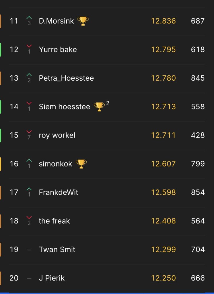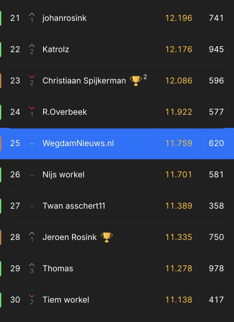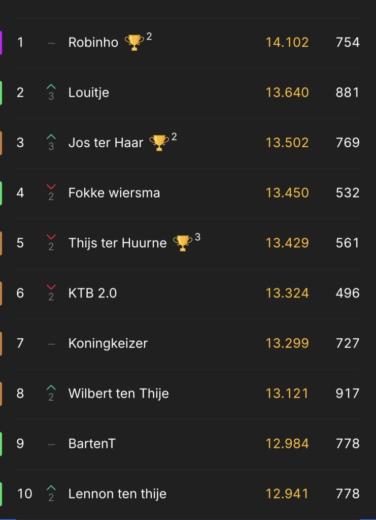 Wie naar de huidige stand kijkt, kan er bijna niet omheen: de koppositie lijkt Robin Raanhuis nauwelijks nog te kunnen ontgaan. Toch blijft het oppassen, want met oud-winnaar Jos ter Haar op de derde plaats weet je het nooit. Desondanks oogt het verschil te groot om in de laatste speelronde van 2025 nog te worden overbrugd.