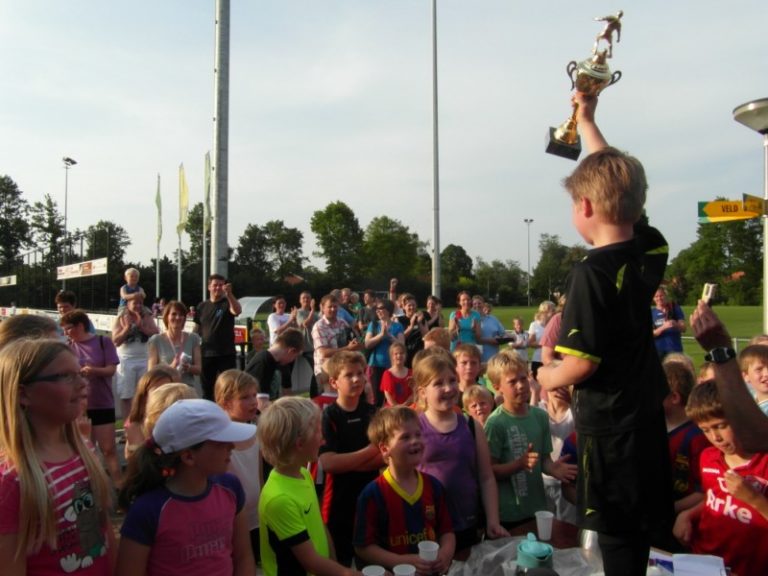 Het blijft een bijzondere happening: de F-jes voetballen tegen de moeders. Je ziet van alles voorbij komen, jongetjes met rode koppies zwoegen voor elke meter, moeders die duidelijk niet gewend zijn aan presteren op de groene mat. Een moeder:” Je ziet toch wel het een en ander veranderen .Mijn zoontje speelde bij de 4x4 een paar jaar geleden, destijds moesten we ons inhouden. Nu enkele jaren later werden we met het grootste gemak naar een ruime nederlaag gespeeld. Worden wij moeders ouder of worden de jongens beter haha!” Spectaculair was het zogenaamde “fietsschieten” met als slachtoffer Jord Bouwmeester op de fiets.