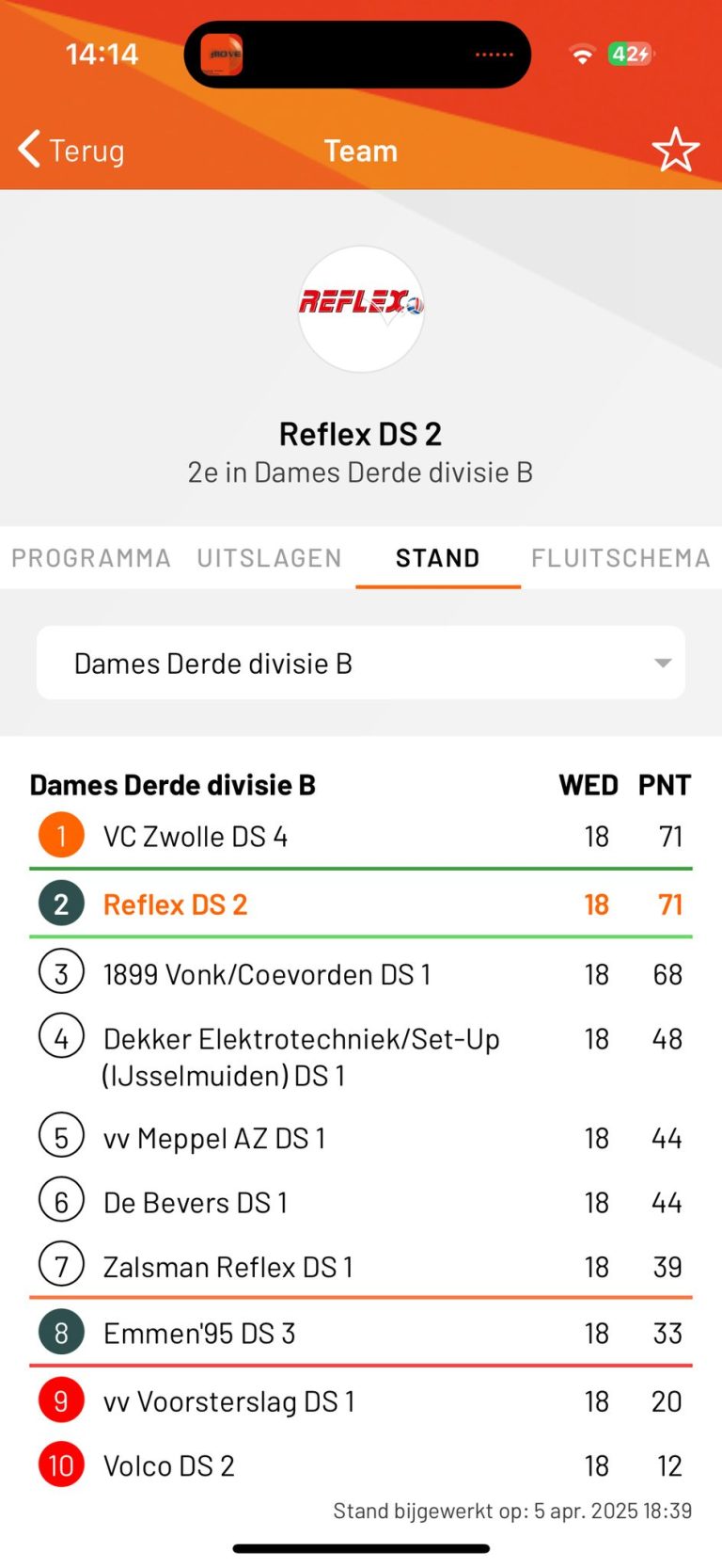 Reflex DS2 is afkomstig uit Kampen. Deze ploeg is als 2e geëindigd in Dames Derde Divisie B. Het team stond gelijk met de koploper uit deze poule. Het doel van Reflex is echter hetzelfde als Cupido, promoveren. Dit belooft een spannende pot te worden.