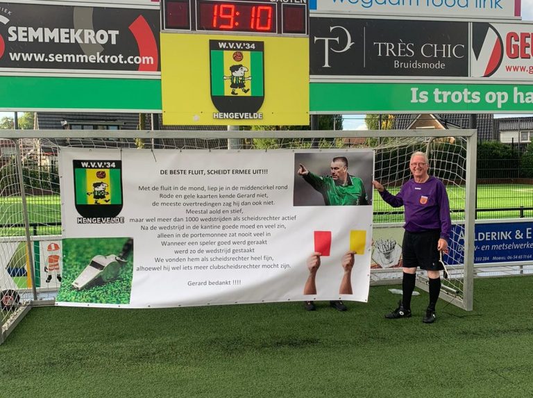 Zo'n 42 jaar floot Gerard Workel wedstrijden in het Twentse amateurvoetbal, waarvan vele bij W.V.V.'34. Menig amateurvoetballer uit de regio kent Gerard als scheidsrechter, maar die tijd is nu voorbij. Met inachtneming van de coronamaatregelen was er vanavond door het bestuur van W.V.V.'34 een wedstrijd tussen het 6e en 7e georganiseerd (1-1), met Gerard als scheidsrechter. Helaas maakte hij de 90 minuten niet vol, want Gerard werd van het veld gehaald met een rode en gele kaart door de scheidsrechters en kleindochter Jessie en kleinzoon Milan.