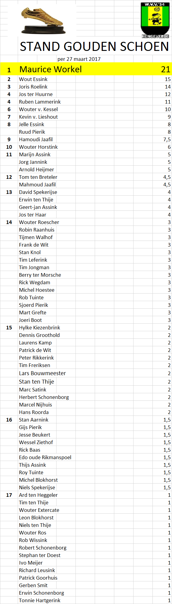 Het is lang stil geweest rondom de persoon Wout Essink. Afgelopen weekend liet hij zijn voeten weer eens spreken. Met maar liefst 4 treffers tegen TVO was hij zeer beslissend voor zijn elftal, het 4e van WVV'34. WVV'34 4 won de wedstrijd zelfs met 5-1 en jawel de andere treffer kwam op naam van broertje Jelle. Maurice krikte zijn seizoen totaal op naar 14 treffers, wat hem op een totaal aantal punten brengt van 21. Het 2e speelde gelijk tegen concurrent RKZVC uit Zieuwent en dus op koers voor de titel.
