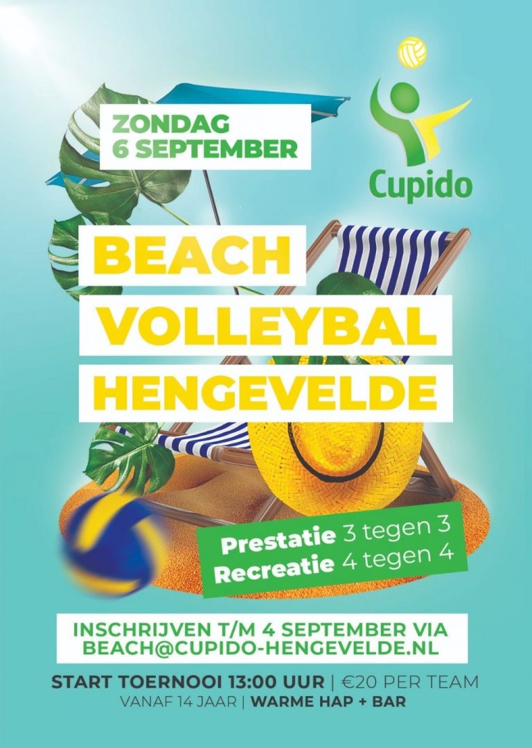 De beachcommissie van Cupido heeft goed nieuws: Het beachtoernooi gaat door! Dit jaar wel enkel voor senioren, deelname is mogelijk vanaf 14 jaar.De recreatie poule speelt 4 tegen 4 en de prestatie poule 3 tegen 3. Het is op zondagmiddag 6 september vanaf 13.00 uur met aansluitend op het veld op en drankje en een snack.... We hebben er weer zin in! Geef je op via:
