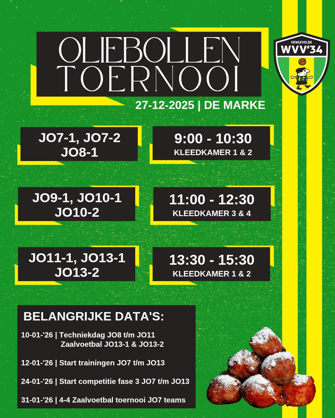 Voor de jeugd onderbouw zijn er in de kerstvakantie weer leuke activiteiten georganiseerd. De aftrap is het Oliebollentoernooi op 27 december. We hopen dat hier zoveel mogelijk spelers bij aanwezig kunnen zijn.