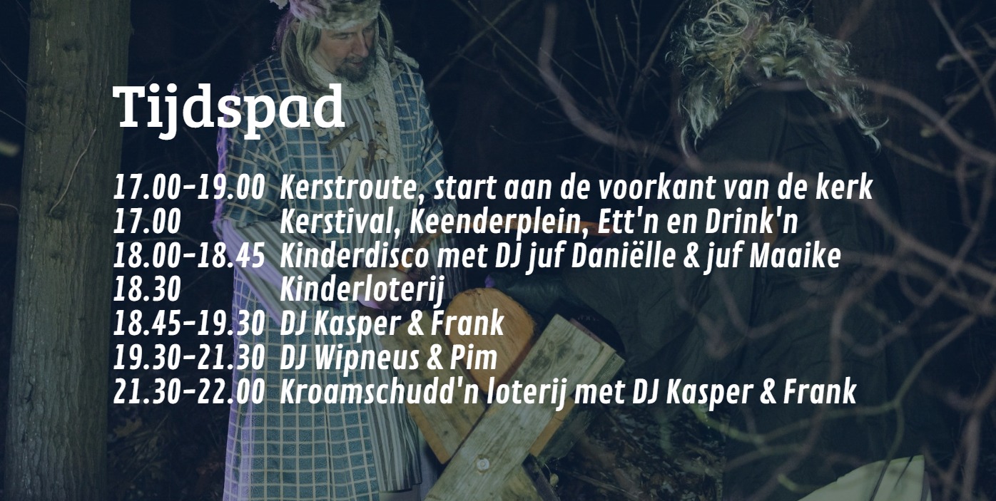 Dus trek je warme jas aan, kom naar Kroamschudd’n in Hengevelde en laat je buik én je hart vullen met gezelligheid. Dit jaar hebben we een menu om je vingers bij af te likken: patat, broodje hamburger of braadworst, snert, oliebollen en natuurlijk glühwein.