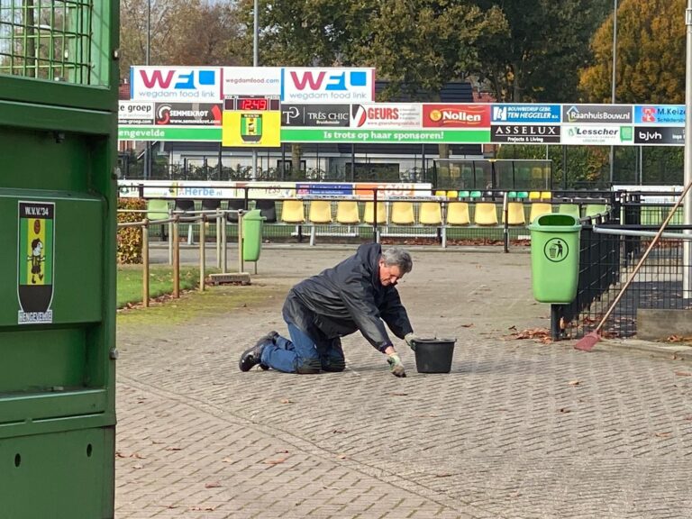 Er gaan veel uurtjes in het onderhoud zitten van het sportpark, hoe plan je dit in? “Het is steeds een combinatie van onderhoud bij W.V.V.’34, eigen tuin (waar ook Annette veel doet) en de tuin bij het ouderlijk huis in Stokkum. Ook soms wat tijdelijk onderhoud bij de tuinen van de kinderen, Robert en Inge. Bij echt slecht weer of grote hitte moet ik het wel eens afzeggen, omdat het dan te veel inspanning kost. Ik werk wel graag ook vroeg in de morgen. Er moet natuurlijk nog wel tijd blijven voor andere leuke dingen, zoals een dagje uit”.