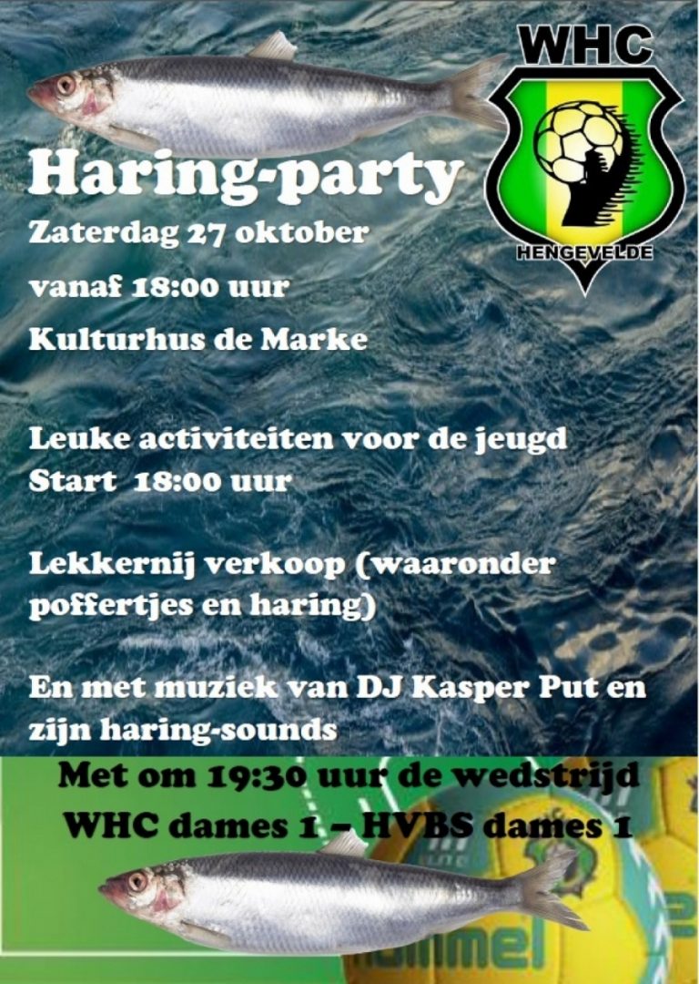 27 oktober is het zover, dan gaan we bij WHC los met de haring-party, dit feestje is voor iedereen van blauw-geel tot groen-geel gekleed en van jong tot oud !!Waar het allemaal mee begonnen is, is de wedstrijd vorig jaar tegen HV Bunschoten-Spakenburg, waar we met een 70-tal supporters onze dames 1 hebben aangemoedigd in Spakenburg, wat een sfeer van het groen–gele legioen en we gingen met winst weer richting Twente.We willen jullie laten genieten van de sfeer, daarom aarzel niet en kom naar de wedstrijd op 27 oktober in Kulturhus de Marke aanvang 19:30 uur.Voor de jeugdleden van WHC starten we deze avond om 18:00 uur met een wedstrijd zonder bal dit keer, maar met papier, potlood en stiften… WELK TEAM maakt het mooiste spandoek, het mooiste spandoek zal gekozen worden door de vaste supporters en een dame van WHC 1. Na afloop van de handbalwedstrijd in de kantine is de bekendmaking (+/- 21:00 uur). Voor de jeugd van Hengevelde zal er in de conferentiezaal vanaf 19:30 uur een echte kinderdisco plaatsvinden, mocht je eerst naar de spooktocht gaan kom dan naderhand lekker even dansen of chillen op hippe muziek van deze tijd.