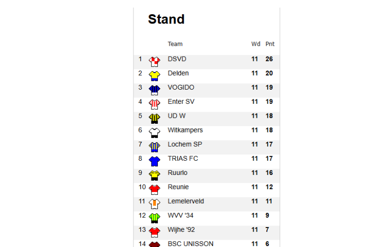 WVV’34 hervat de competitie na 8 december morgen om 14.00 uur thuis tegen UD Weerselo en heeft na de 5-0 nederlaag tegen DSVD een sterke reeks neergezet. De ploeg bleef vier wedstrijden op rij ongeslagen: thuis tegen Lemelerveld werd een 3-2 overwinning behaald, uit tegen Witkampers eindigde het in een 2-2 gelijkspel, en thuis tegen Enter leverde opnieuw een 2-2 remise op. Bovendien werd de oefenwedstrijd tegen het eerste zaterdagteam van HSC’21 met 2-1 gewonnen.