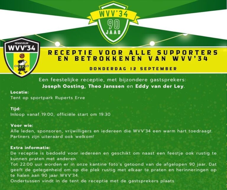 Kom gezellig naar de feestelijke receptie van WVV’34