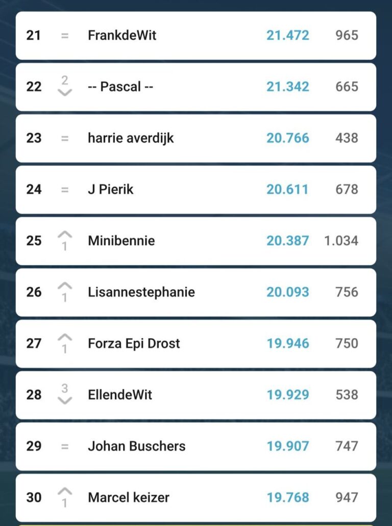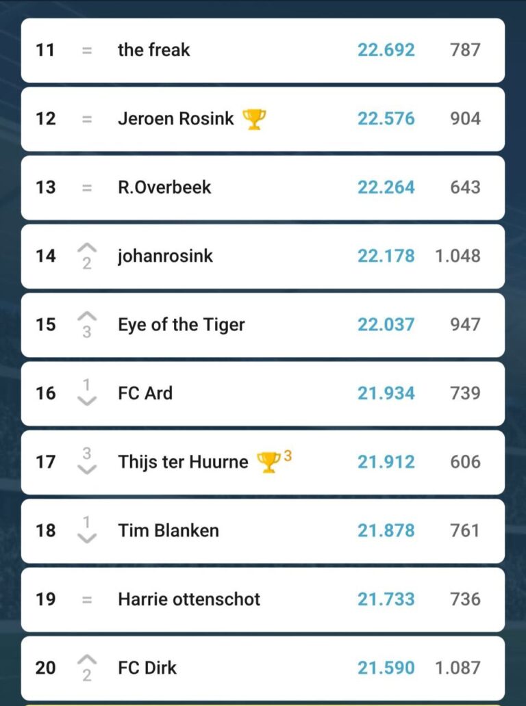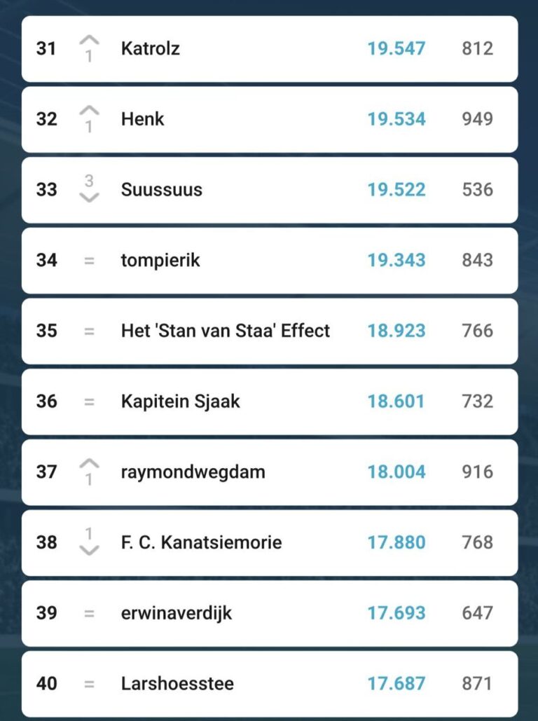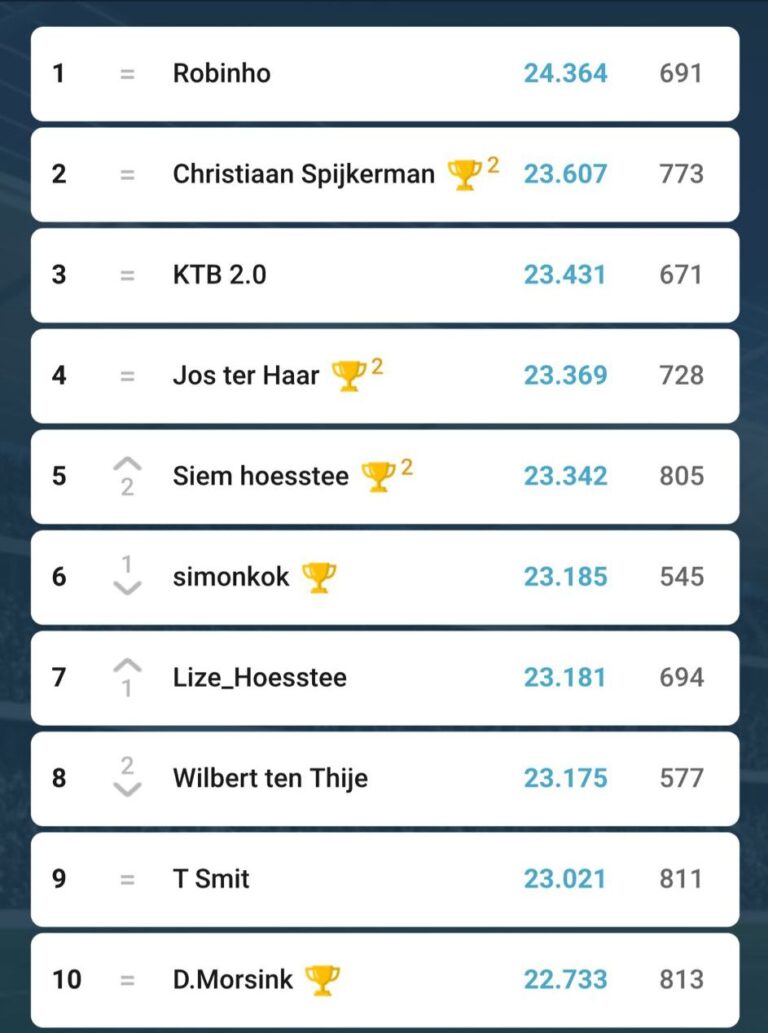 Komend weekend brandt het weer los in het Nederlandse voetbal, dus ook voor de Marcel keizer Eredivisie. Met nog acht wedstrijden voor de boeg heeft Feyenoord een voorsprong van zes punten de kenners beweren dat dit genoeg is. Maar hoe zit dat met onze koploper Robin Raanhuis? Hij heeft weliswaar een grote voorsprong, maart met een nummer twee als Christiaan Spijkerman weet je het nooit natuurlijk!