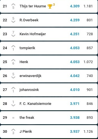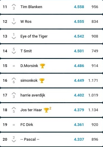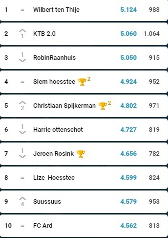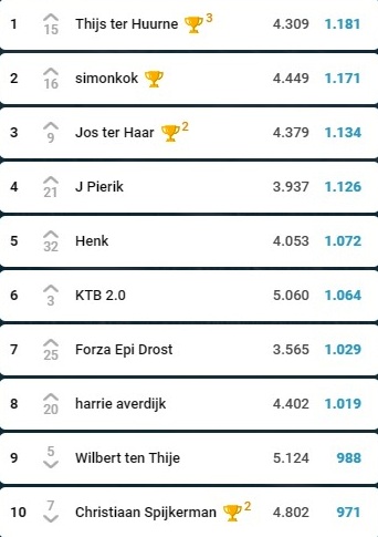Maar goed, de verschillen zijn klein, Wilbert voelt de hete adem van zijn achtervolgers Kevin ten Buuren, Robin Raanhuis, Siem Hoestee en uiteraard Christiaan Spijkerman.