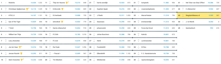 Vooral Robin Raanhuis is in topvorm. Hij staat bovenaan, en dat is niet voor niets. Sinds hij zijn eigen voetbalschoenen vrijwillig in de welbekende wilgen van het Rupertserve heeft gehangen, is hij zich gaan focussen op kennis van de vaderlandse Eredivisie en haar spelers. Dit legt geen windeieren, want Robin staat fier aan kop, gevolgd door de man die als trainer aan de weg timmert bij SV Delden, Christiaan Spijkerman. Maar het spel is uiteraard nog niet gespeeld, want ook Kevin ten Buuren loert op zijn kans en zit in het kielzog van Raanhuis en Spijkerman. Hieronder de stand: