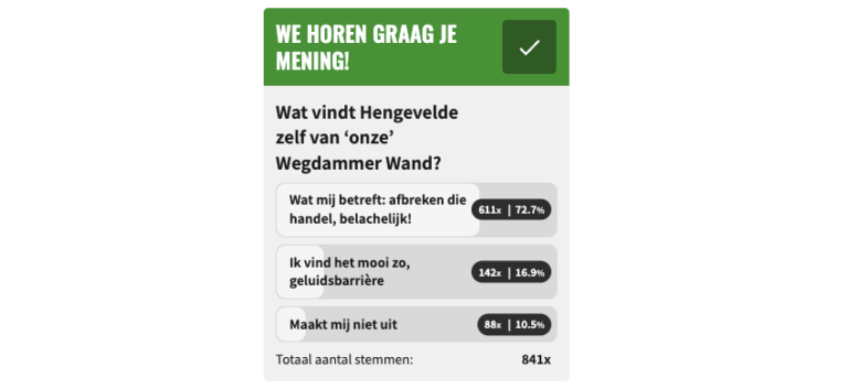 Het was vorig jaar bij de aanleg van de ‘Wegdammer Wand’ aan menig keukentafel in het Wegdamse een punt van discussie. Is zo’n grote muur nodig en willen we dit wel in het dorp. Een eerste peiling gaf destijds aan dat 72% van de lezers graag wilde dat de wand werd afgebroken, maar de meningen zijn inmiddels behoorlijk bijgesteld. Hoewel nog 50,4% van de 1138 stemmers de wand nog steeds niks vindt, snapt inmiddels 45% de functie wel. Slechts een kleine groep weet het niet en heeft nog altijd twijfels (4,7%).