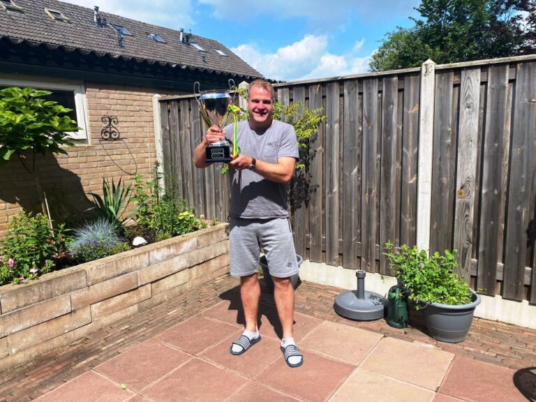 Aanvankelijk zou hij de prijs op het W.V.V.’34 Voetbalgala in ontvangst nemen, maar het bedrijvenuurtje in Bentelo had voorrang dus zou de redactie van Wegdamnieuws de geel groen getinte beker in het blauw overhandigen. Corona gooide echter roet in het eten.