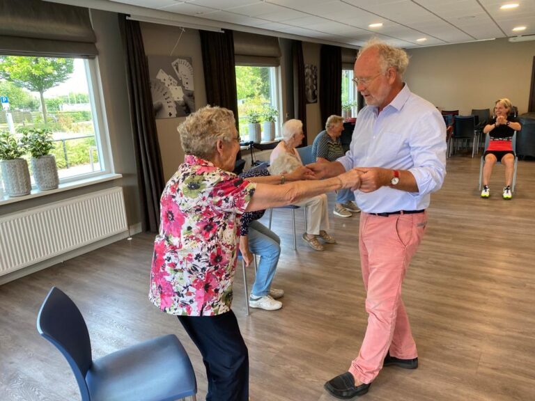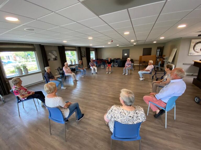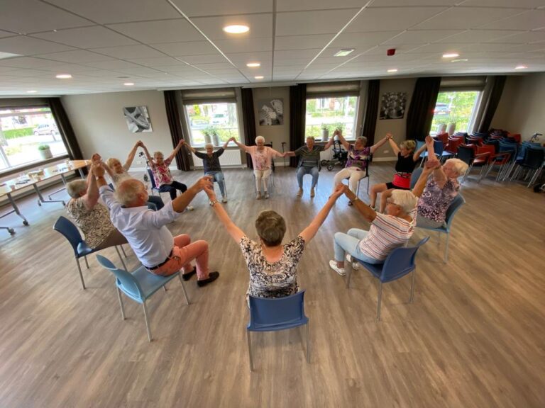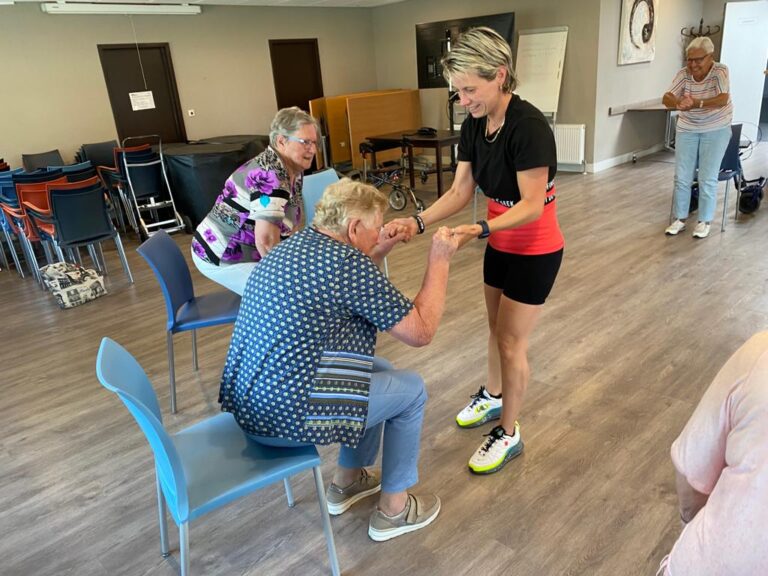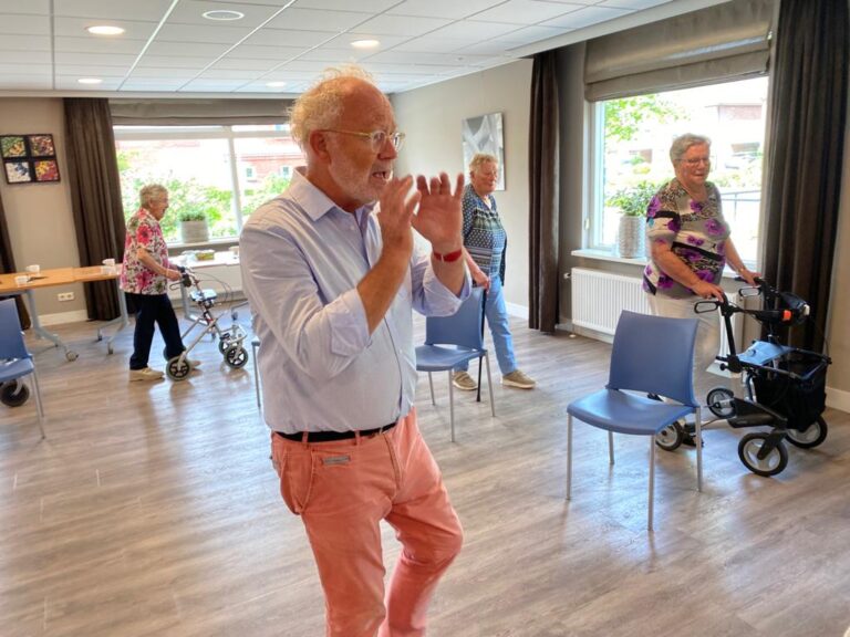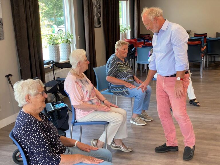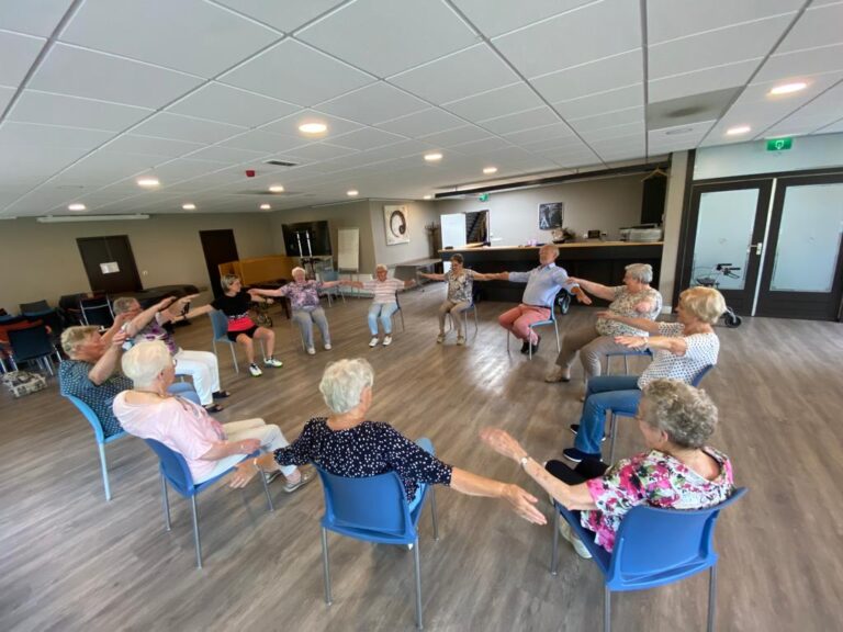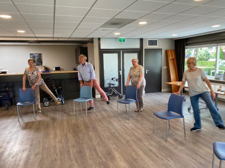 “Ik bin d’r helemoal kloar met”’, grapt Rob na de laatste oefening. Daar was gedurende het half uur gym op dinsdagmiddag in de conferentiezaal van de Marke weinig van te merken. Met groot enthousiasme en vooral ook vakmanschap weet hij de groep dames op een nuttige manier bezig te houden. Op een stoel, naast de stoel en achter de stoel worden bijna alle spiergroepen aangesproken, met de bedoeling tot op hoge leeftijd fit en mobiel te blijven.