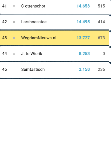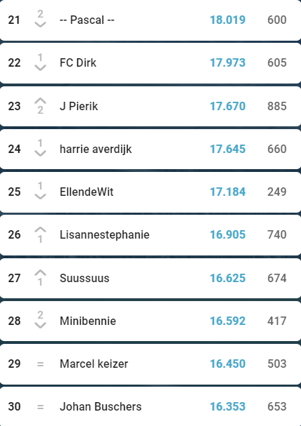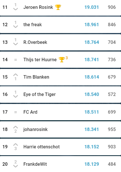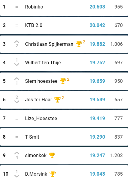 De Wegdamnieuws Eredivisie was in de eerste competitiehelft misschien wel spannender dan ooit. Maar de kaarten lijken inmiddels geschud met de eindstreep in zicht. Kwaliteit komt altijd bovendrijven, zo laat Robin Raanhuis maar weer eens zien. Zijn uitdagers Kevin ten Buuren en Christaan Spijkerman moeten het doen met de uitdrukking ‘paarden die haver verdienen krijgen ze niet’, want ondanks hun verwoede pogingen heeft Robin de sprint ingezet en zo’n 600 punten voorsprong op Kevin en 800(!) op Christiaan. Echter schijnen zij zich nog niet helemaal neergelegd te hebben bij een overwinning van Robin. Geleerden zeggen wel eens dat je vossen met vossen moet vangen, dus wellicht komt er nog een konijn uit de hoge hoed van de achtervolgers.