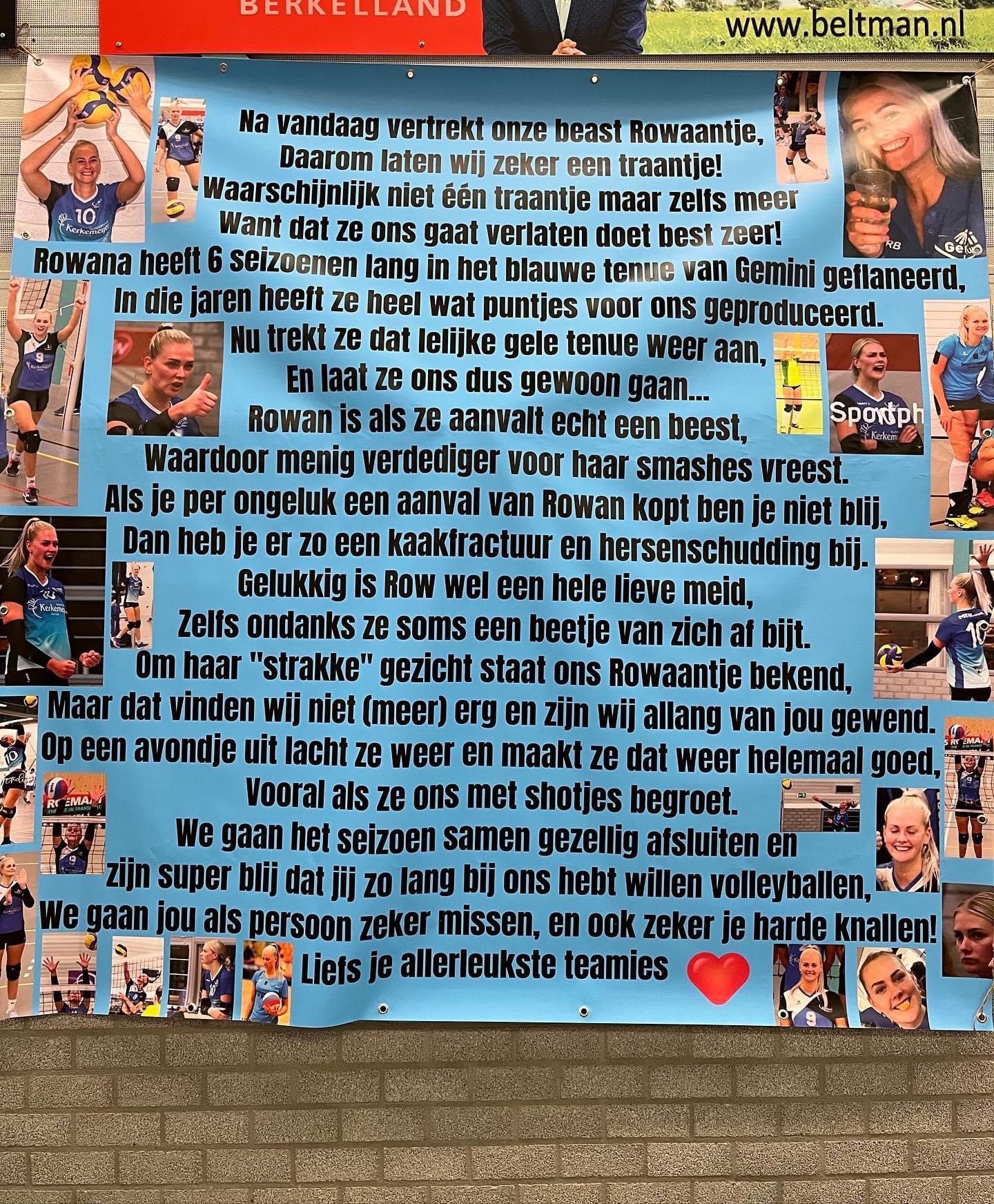 Rowan legt tegenover Wegdamnieuws uit waarom ze weggaat bij Kerkemeijer Gemini: “De reden dat ik nu stop is omdat ik lekker dicht bij huis wil gaan volleyballen. Zes jaar geleden vertrok ik van Cupido naar Gemini omdat de trainer destijds van Cupido naar Borculo ging en vroeg of ik mee wilde. Cupido speelde toen 1e klasse en Gemini derde divisie. Het leek me een leuke uitdaging om wat hoger te spelen. We zijn met Gemini gepromoveerd naar de 2e divisie drie jaar geleden. In de tussentijd is Cupido ook gepromoveerd, naar de promotieklasse en gaan nog promotie-/degradatiewedstrijden spelen voor de derde divisie. Ik wil ze hiermee al vast heel veel succes wensen. Zou een super prestatie zijn voor Hengevelde om derde divisie te spelen!”, aldus de volleybalster.