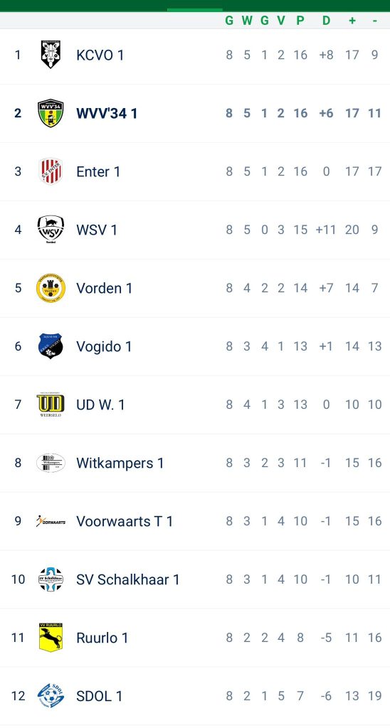 De Hengeveldenaren verkeren de laatste weken bovendien in een goede vorm. In de afgelopen drie wedstrijden werden de volle negen punten gepakt, waarvan zes tegen de toenmalige koploper. Die sterke reeks bracht WVV’34 naar de zesde plaats op de ranglijst met 26 punten.