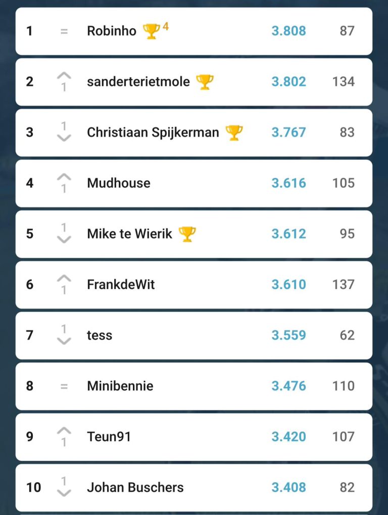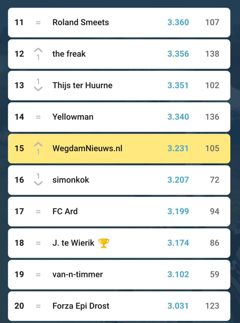 Maar de echte spanning speelt zich af dichter bij huis: gaat Robin Raanhuis zijn tweede titel pakken, na zijn winst in 2023? Of kroont Sander te Rietmole zich zondag tot Wielerkenner van 2025 in de Wegdamnieuws Tourpoule? Het verschil tussen beide heren is slechts zes punten!