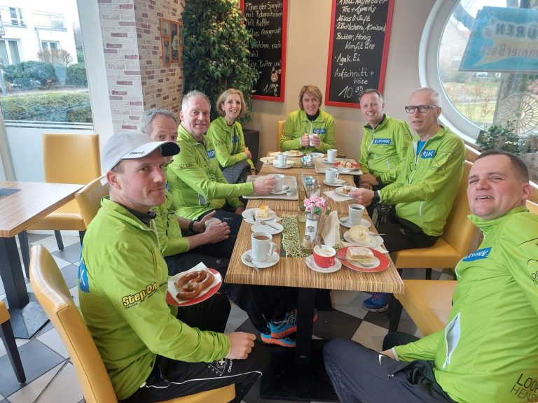 Vijf lopers besloten daarna nog een extra etappe in te lassen richting de bakkerij, waar de hele groep uiteindelijk samenkwam om te genieten van koffie met gebak. Een geslaagde dag vol sportiviteit en gezelligheid!