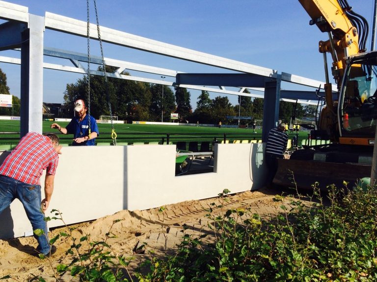 Zoals we twee maand geleden al hebben gemeld, krijgt WVV'34 een tribune. Het wordt een overkapping in een L-vorm. Achter de stoeltjes kunnen mensen staan en daarachter komt nog een verhoging. De werkzaamheden worden voornamelijk op zaterdag gedaan door vrijwilligers, zo ook gisteren. Voorzitter Jan de Witte: "In de week van maandag 3 november aanstaande komt Doeschot de platen op het dak plaatsen, dan kan de tribune ook in gebruik! Er komen drie ingangen aan de achterkant en tot zover verloopt alles naar wens. De betonnen wanden zijn van afkomstig van Geurs."