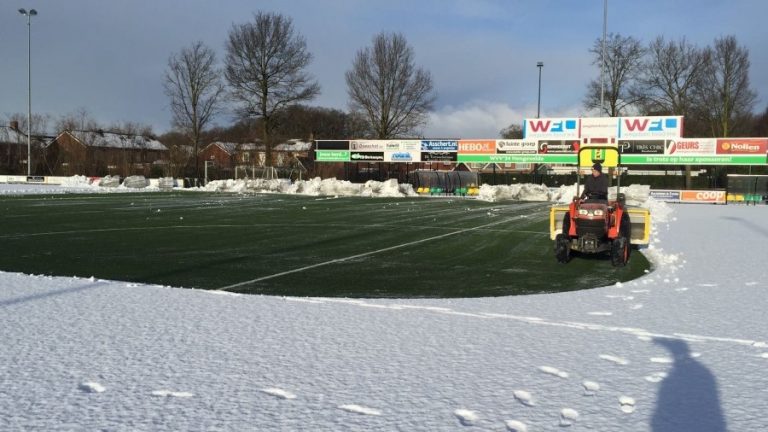 Op dit moment is Thijs Aarnink druk bezig om het kunstgrasveld van voetbalvereniging WVV’34 sneeuwvrij te maken. De wedstrijd vanmiddag tegen FC Eibergen gaat dus gewoon door. Het bakje waar de veegwerkzaamheden mee verricht worden heeft de club zelf aangeschaft, de trekker is van Geurs Loon- Grondverzet- en Transportbedrijf