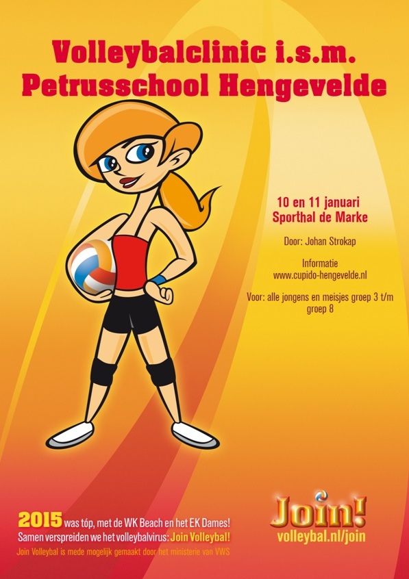 Volleybalvereniging Cupido heeft in samenwerking met de volleybalbond NEVOBO onder leiding Johan Strokap de clinic Join Volleybal georganiseerd. (KLIK HIER VOOR EEN FILM-FOTOALBUM) De afgelopen twee dagen voerde volleybal de boventoon in de Hengeveldse sporthal. Dinsdag waren de beide groepen 6 en 8 van de Petrusschool aan de beurt, vandaag (woensdag) konden de groepen 3-4-5 en 7 aan de bak. In het begin werden er oefeningen gedaan om goed warm te worden, daarna kwam het ‘echte volleybal’ aan bod. Karlijn Wensink: “Alle technieken kwamen aan bod en natuurlijk ook smashen, dit vonden de kinderen maar wat gaaf!” Vrijwilliger Inge Workel:”Het was een erg leuke clinic, het enthousiasme straalde er vanaf!” De campagne Join Volleybal is door de Nevobo ontwikkeld om de volleybalsport in al haar vormen zo breed mogelijk te promoten.