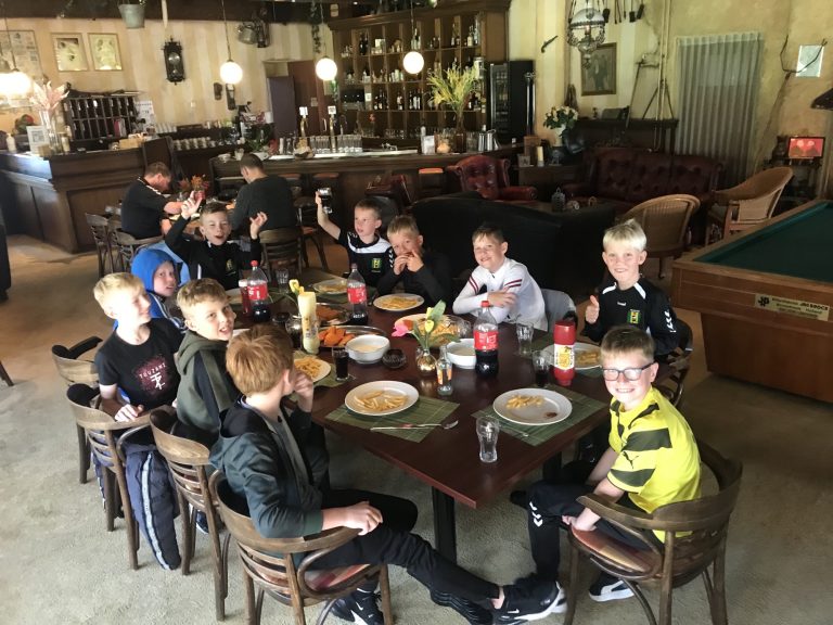 “Na 5 gewonnen wedstrijden stond vandaag de laatste wedstrijd van de eerste fase op het programma. Tegen SV Delden moest het vandaag gebeuren. Bij winst of een gelijkspel was het kampioenschap binnen. De jongens begonnen wat onwennig aan de wedstrijd. Er werden niet veel kansen gecreëerd maar ook niets weggegeven. Door een goede samenwerking in de verdediging had keeper Thomas weinig te doen. De jongens begonnen wat los te komen en beter te combineren. Dat resulteerde in wat kansen, maar nog geen doelpunten. Door een doelpunt van Lars was de ruststand 1-0. De tweede helft was het weer eenrichtingsverkeer richting het doel van de tegenstander. Er werd goed samengespeeld en hard gewerkt. Veel kansen, maar geen doelpunten. Uiteindelijk gooide Siem de wedstrijd op slot door de 2-0 te scoren. Dat was ook de eindstand en zo werd het kampioenschap binnen gesleept. Na afloop van de wedstrijd zijn we met het hele team bij onze sponsor Hotel ‘t Holt geweest. Micha en José: bedankt voor de gastvrijheid!!”