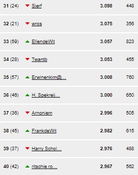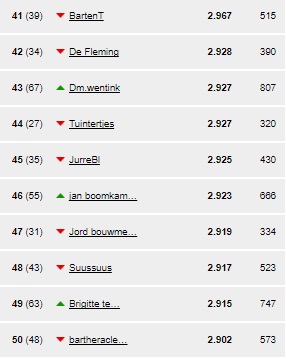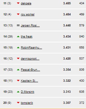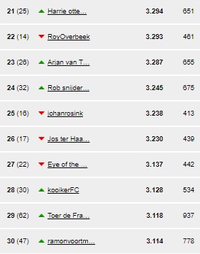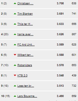 Waar koploper van vorige week Kevin ten Buuren het nu met een achtste positie moet stellen, is allround kenner en kanshebber voor de titel Christiaan Spijkerman die zich laat gelden. Hij staat bovenaan na de zevende speelronde. Veel zegt het misschien niet voor het eindklassement, maar de eerste punten op weg naar de overwinning zijn in ieder geval binnen. Hij wordt gevolgd door outsider Tim Blanken en sluwe vos Thijs ter Huurne, die altijd in de top te vinden is. Harrie Averdijk en Ard Assink volgen op de voet. Na dit weekend, waarin onder meer FC Twente - Heracles wordt gespeeld, weten we meer! Hieronder de stand: