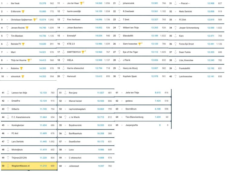 Dat Gijs Eijsink jarenlang op de sportredactie van uw krant heeft gewerkt legt hem tijdens zijn pensioen geen windeieren. Hij staat namelijk bovenaan en geeft oud-kampioenen als Christiaan Spijkerman en Robin Raanhuis voorlopig het nakijken. Hoewel de grote namen uit de geschiedenis van de Hengeveldse Eredivisie in de top 10 staan, is het de oudgediende die vriend en vijand doet verbazen. Gaat hij een gooi doen naar het kampioenschap, of blijkt Gijs een eendagsvlieg? Achter Gijs volgen Dani Morsink en Christiaan Spijkerman. Wie zich ook aan de kop heeft gemeld is Jeroen Rosink. Zelf raast hij nog altijd op de Twentse voetbalvelden, maar ook strategisch blijkt hij geen onverdienstelijke rol te spelen in de voetbalwereld. Spanning en sensatie, hieronder de volledige stand: