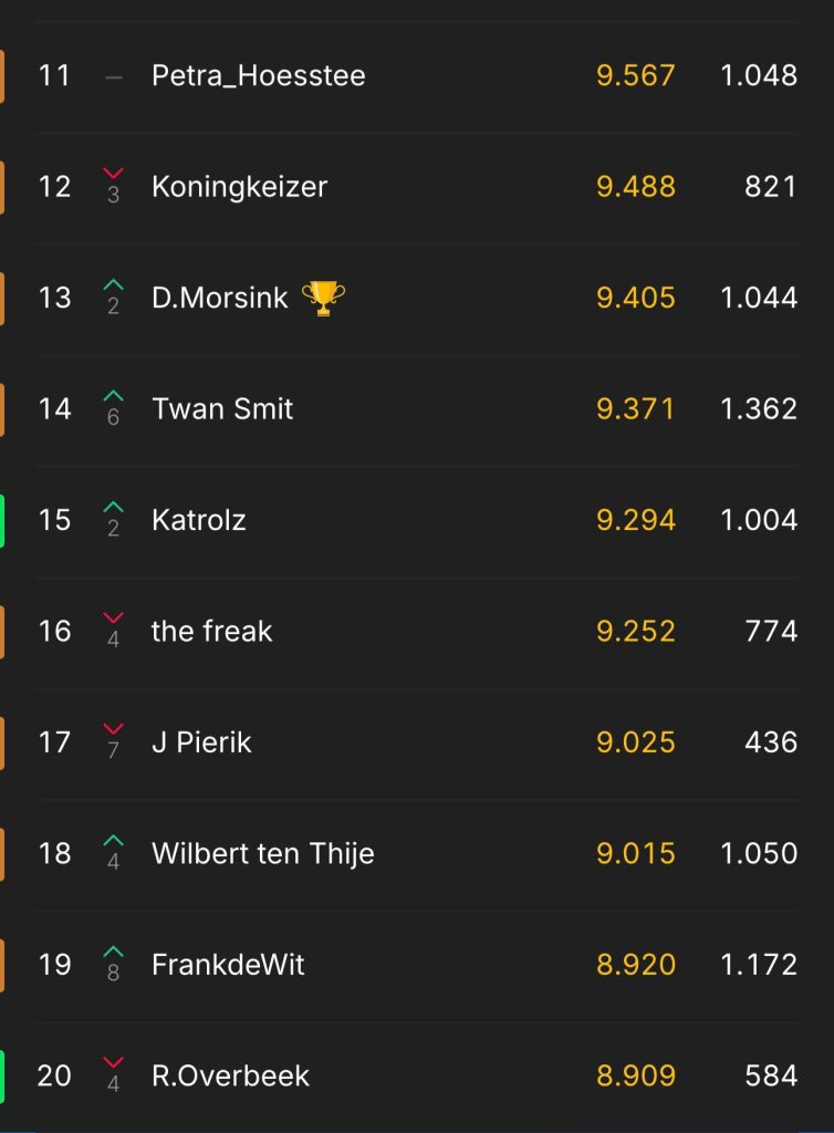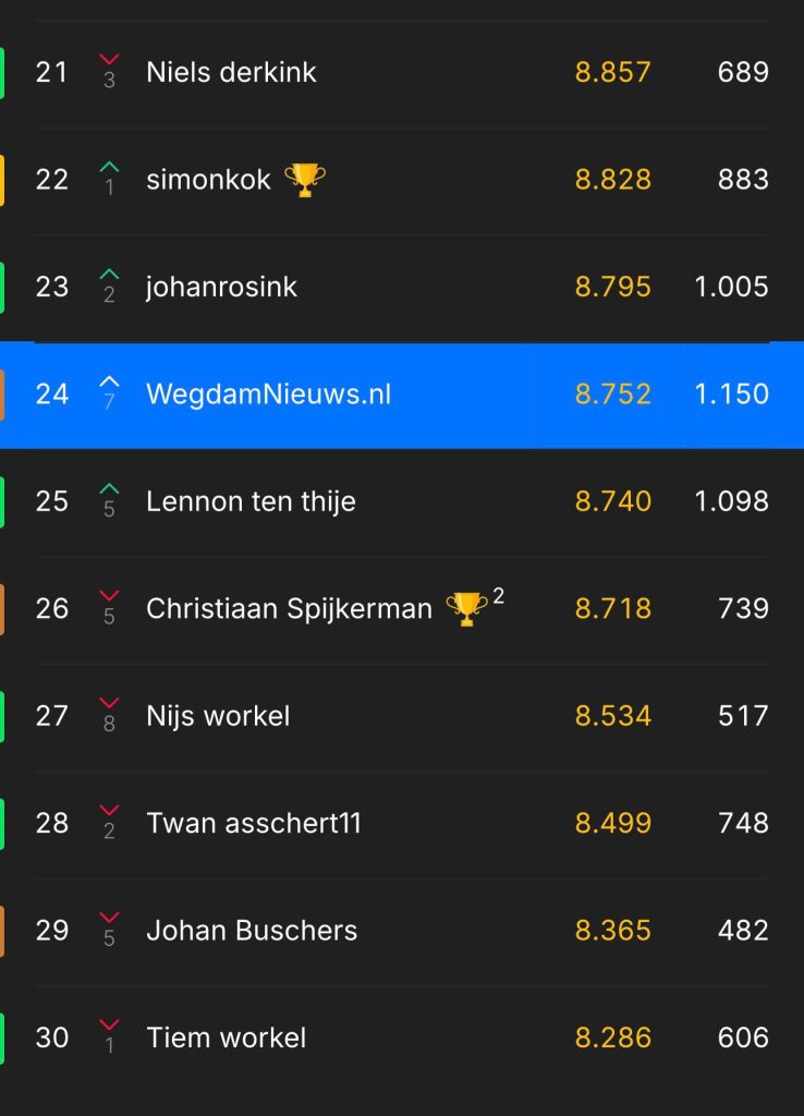 We liggen een weekje langer stil, maar de deelnemers van de WegdamNieuws Eredivisie zijn alweer druk aan het broeden op hun volgende zet. De top van het klassement blijft voorlopig ongewijzigd: Robin Raanhuis voert nog altijd fier de lijst aan. Op gepaste afstand volgt Mike Wijlens, spelend onder de schuilnaam Fokke Wiersma, terwijl Jos ter Haar de top 3 compleet maakt.