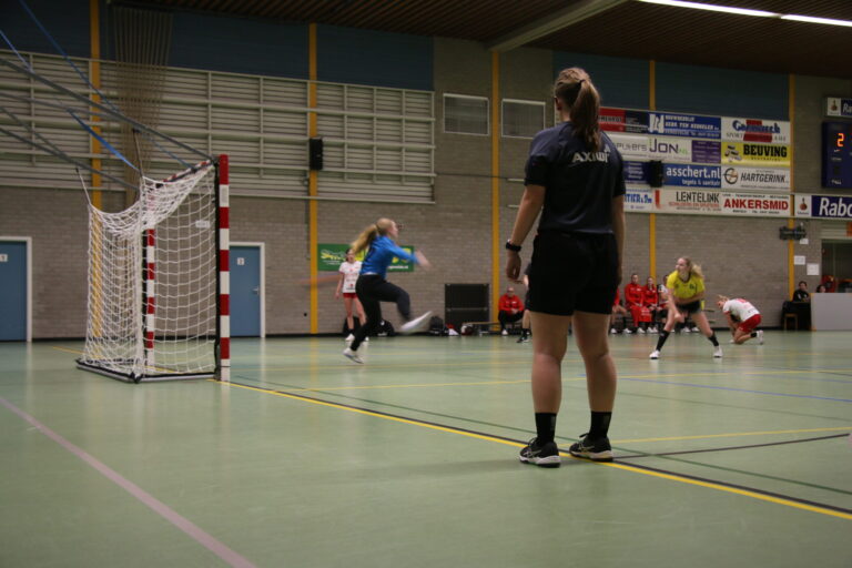 Lois kreeg zelfs overigens twee maal ‘twee minuten’, zoals op één van onderstaande foto’s te zien is. Hierover zegt ze: “Wat moet ik erover zeggen. De eerste keer in een break out kon ik niet meer op de rem maar daardoor wel terechte 2 minuten. De tweede keer haakte zij in met haar arm en vond ik persoonlijk geen tijdstraf. Maar goed, dat gebeurd bij handbal, het blijft een contactsport.