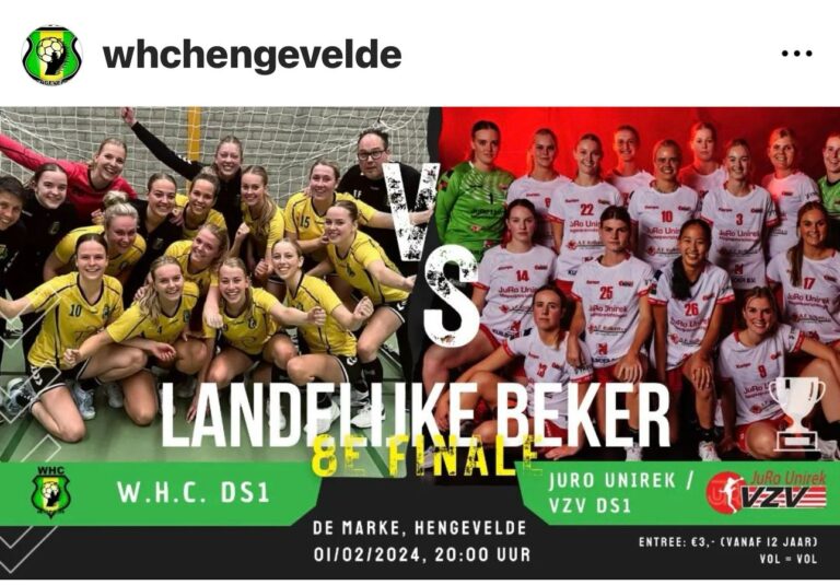 “Morgenavond speelt onze dames 1 de 8e finale in beker tegen W.H.C. in Hengeveld” staat op hun Facebookpagina, de plaatsnaam is al niet goed. Verder op die pagina: