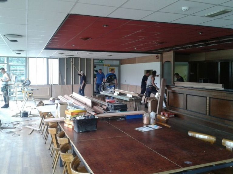 Ondanks dat de zomerstop is aangebroken en iedereen van het WK voetbal geniet is de verfraaiing van de kantine in volle gang. Dankzij de fanatieke vrijwilligers die de club rijk is, begint nu ook in het echt duidelijk te worden hoe de kantine er daadwerkelijk uit gaat zien. Gisteren waren er maar liefst 12 vrijwilligers op het sportpark aan de gang. Schilder Lentelink gaat aankomende week beitsen en lakken, ook het verhoogd plafond krijgt een andere kleur. Tevens worden de rode gordijnen vervangen.