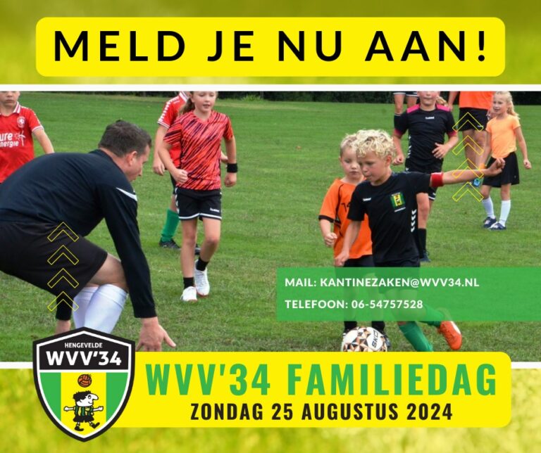 Op zondag 25 augustus is er weer de jaarlijkse WVV’34 familiedag. Heb jij je team al samengesteld? Meld je snel aan en beleef samen met ons een fantastische dag vol plezier, sport en gezelligheid!