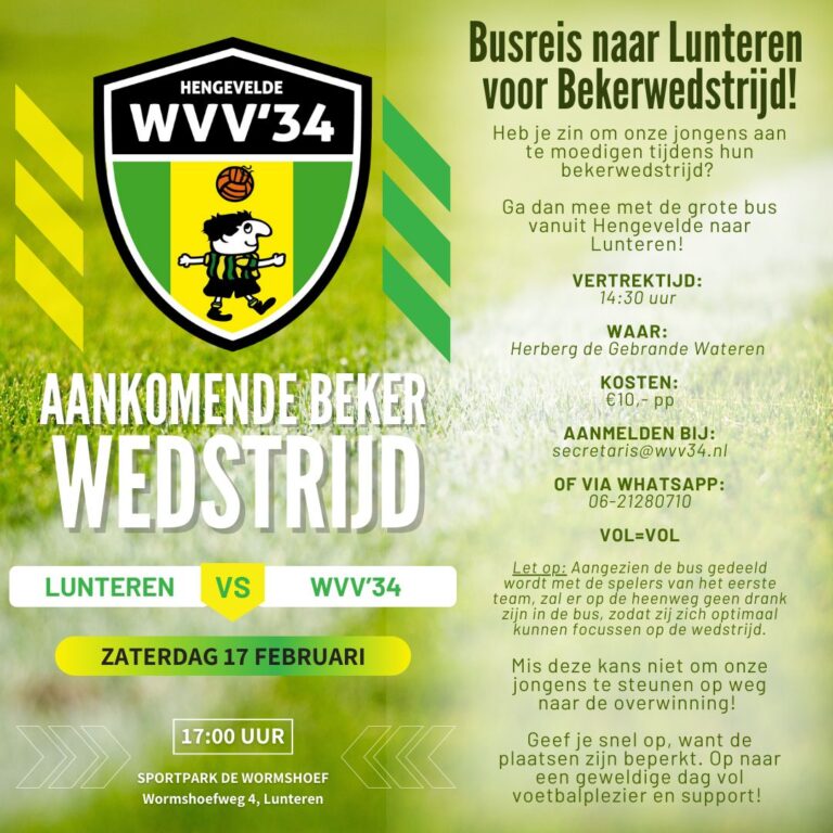 WVV’34 stapt vanmiddag om 14.30 in de bus voor een bekerwedstrijd in de 4e ronde. De tegenstander om 17.00 uur is VV Lunteren, een amateurvoetbalvereniging uit Lunteren, gemeente Ede in de provincie Gelderland. Het eerste elftal komt uit in de Tweede klasse zaterdag in het KNVB-district Oost.