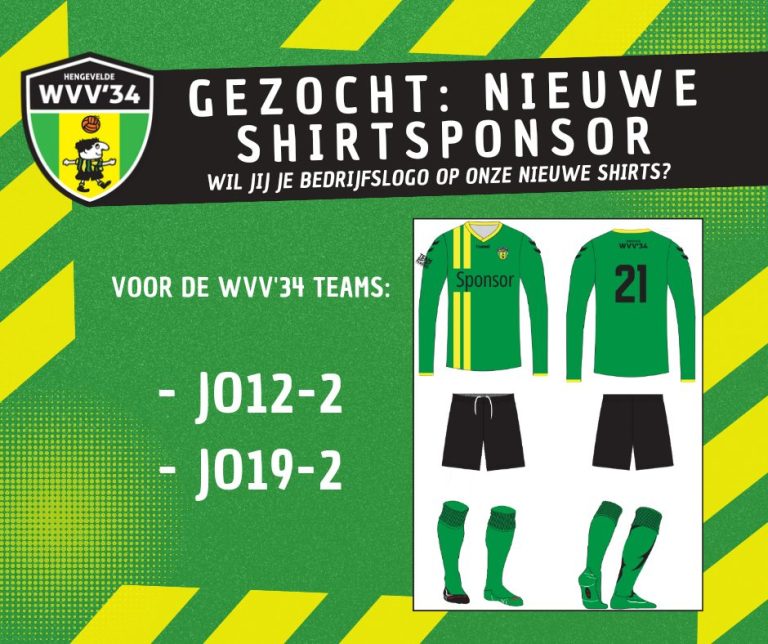 Tijdens het jubileumweekend is er gestemd op het nieuwe tenue en deze willen wij in de winterstop uitleveren aan onze leden. Nu zijn binnen de jeugdelftallen van WVV’34 de teams JO19-2 en JO12-2 nog op zoek naar een shirtsponsor.
