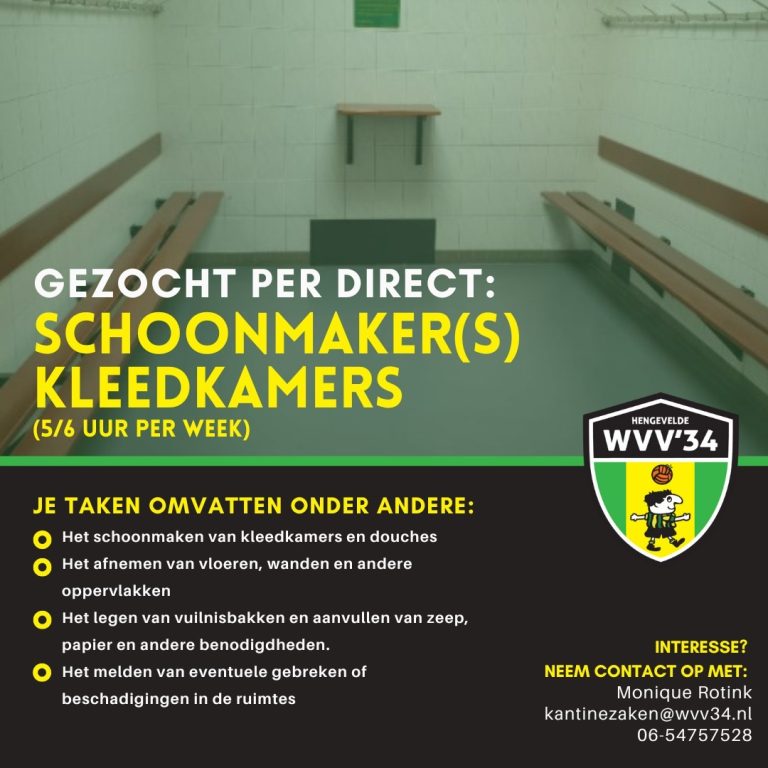 WVV’34 is per direct op zoek naar nieuwe schoonma(a)k(st)ers voor de kleedkamers van onze voetbalvereniging! ⚽️ Na meer dan 15 jaar trouwe dienst heeft Denise besloten een nieuwe uitdaging aan te gaan.