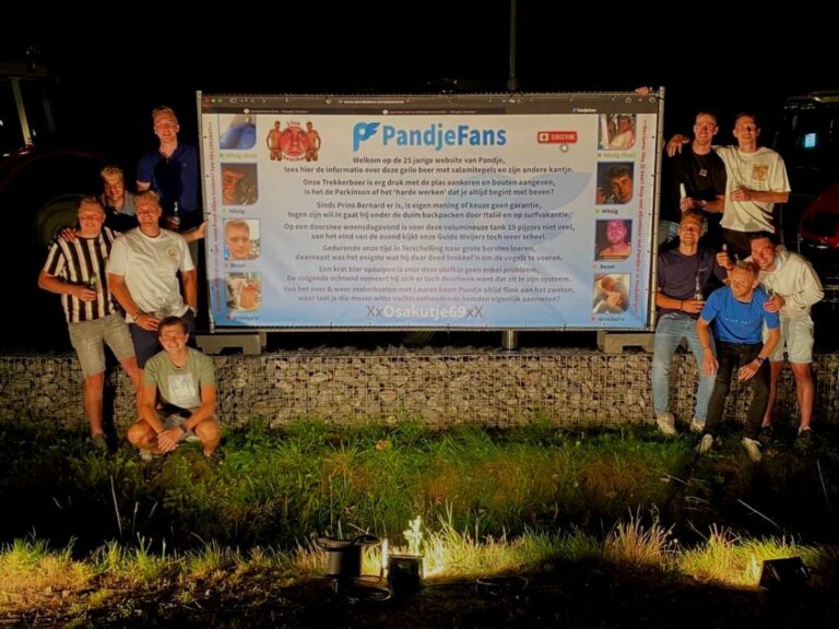 Gijs denkt dat hij er ongezien vanaf komt , maar ook hij ontkomt niet aan een mooi spandoek van zijn kameraden.