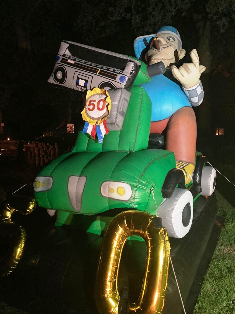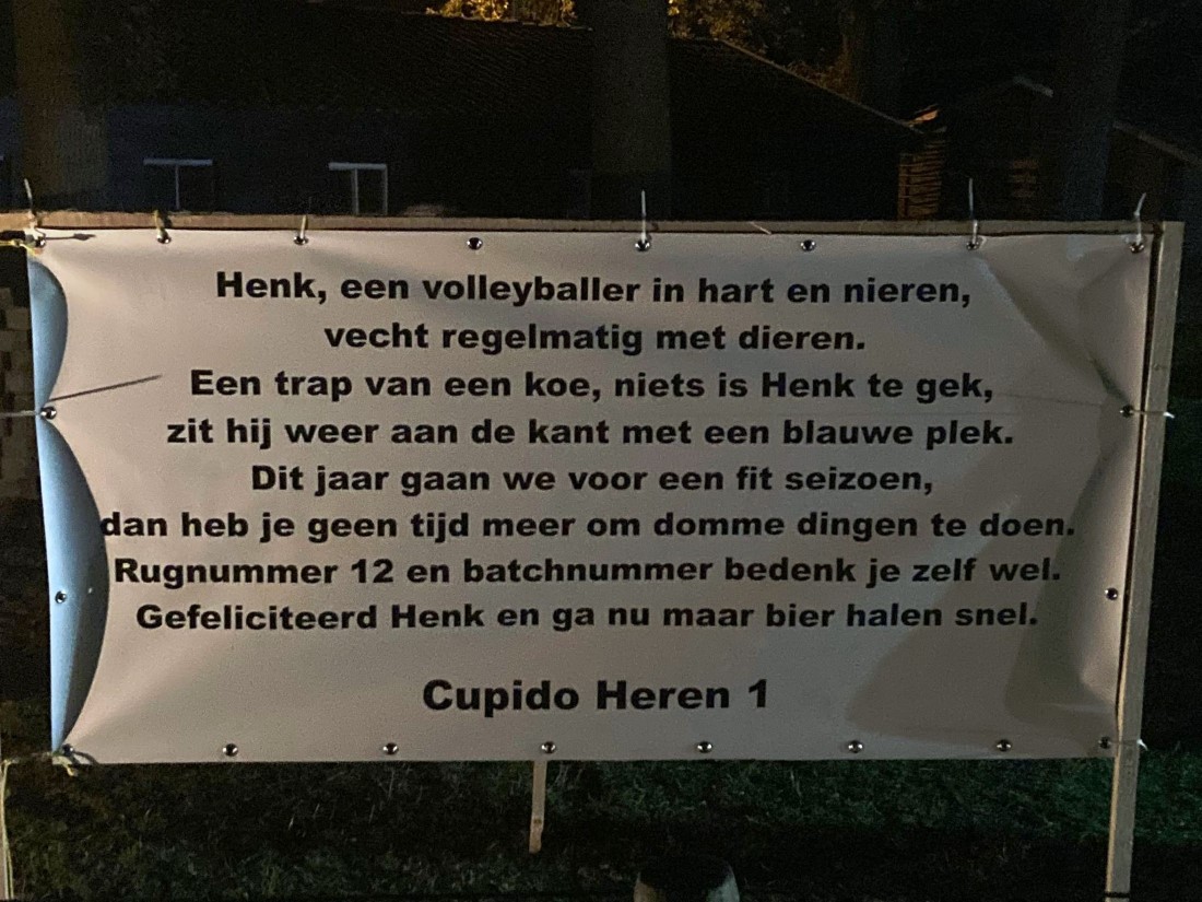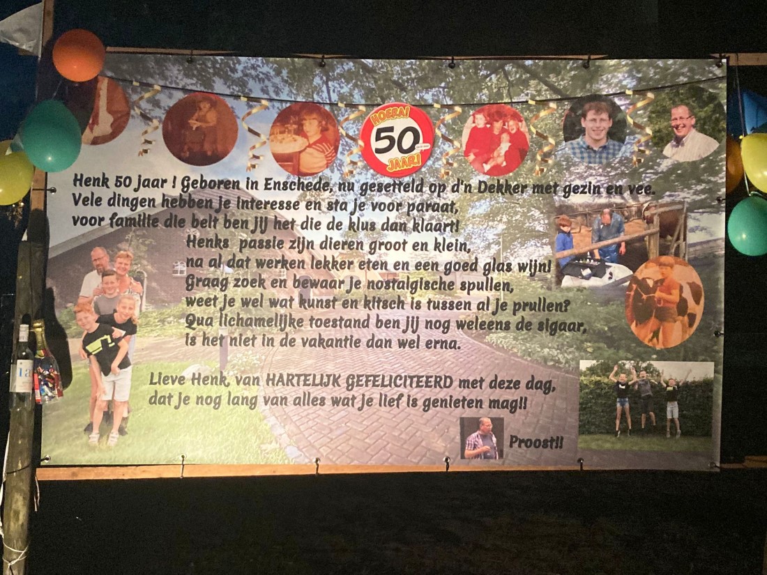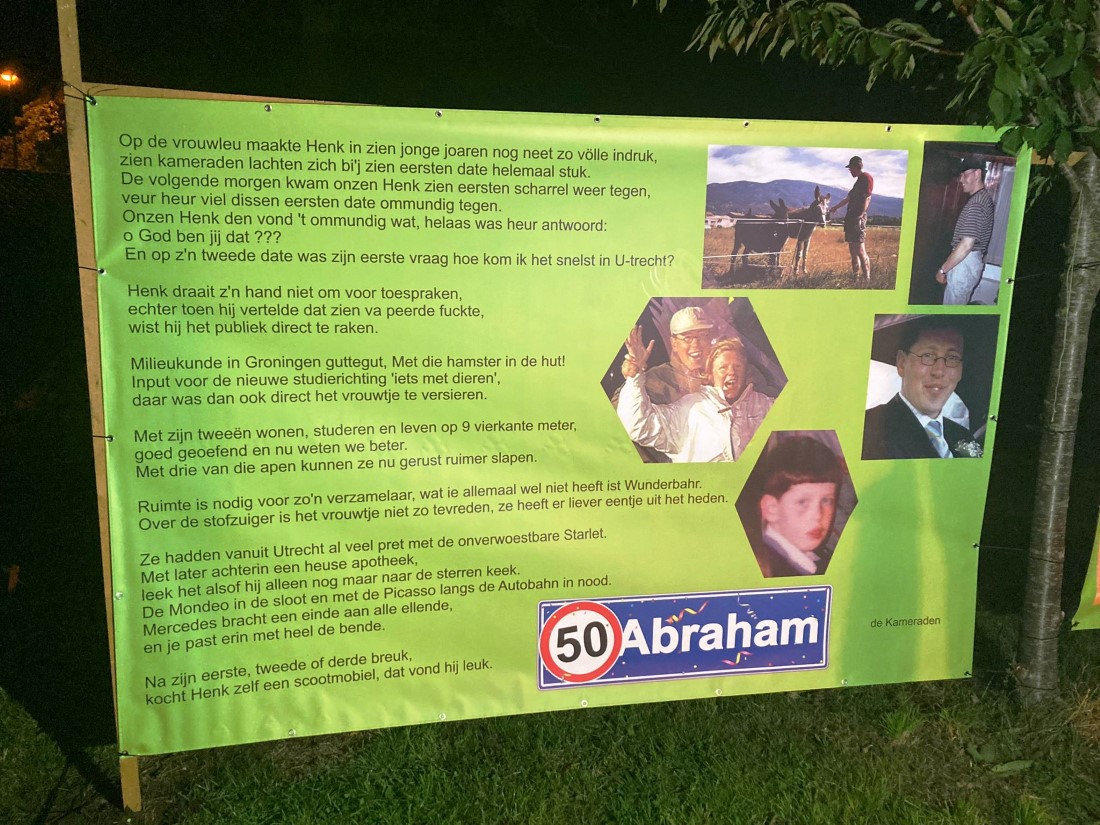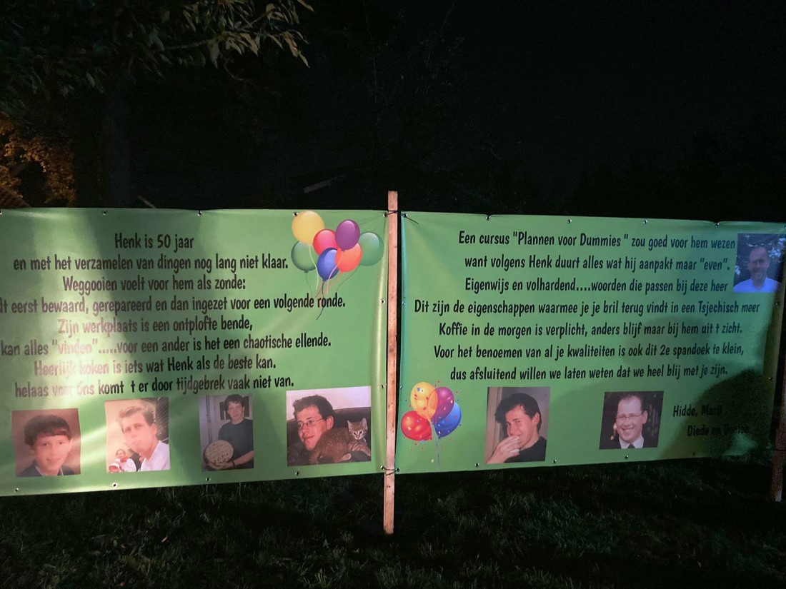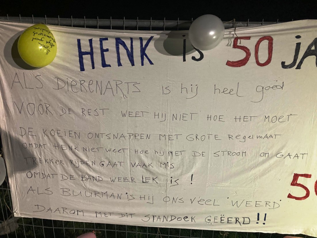 “Onze buurman Henk Meijer wordt morgen 50. Ze hebben de tuin mooi versierd”.