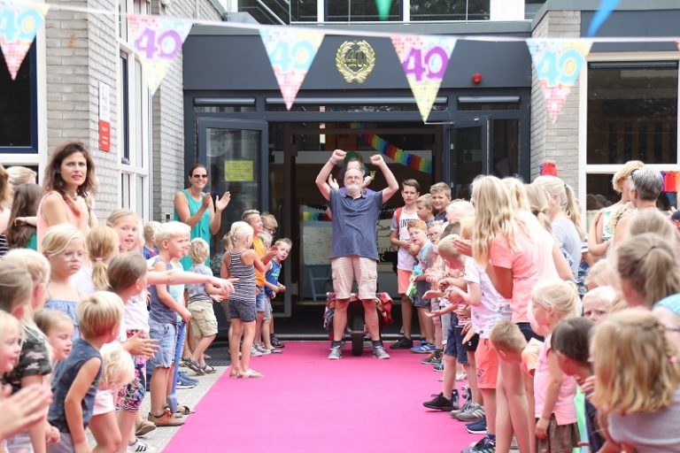 Na 40 jaar gewerkt te hebben op de Petrusschool, heeft Hennie Leliefeld gisteren afscheid genomen. Hij gaat nu genieten van zijn welverdiende pensioen. Het was een afscheid in een zeer feestelijke stemming, helemaal passend bij Hennie. ’s Ochtends stapte Hennie samen met zijn vrouw, kinderen en kleinkinderen op een fietstrein. Samen legden ze de route van Bentelo naar Hengevelde af, de route die Hennie al die jaren gefietst heeft. Alleen was de route dit keer met diverse tussenstops. Onderweg stonden nl. steeds groepen leerlingen in een weiland of op een erf om een optreden voor Hennie te verzorgen. Er was, helemaal passend bij Hennie, veel zang en dans. Waarschijnlijk heeft Hennie nog nooit zo lang over de fietstocht gedaan. Om 11 uur kwam hij op school aan. Daar zong de hele school het feestlied voor meneer Hennie. Op een feestdag mag taart natuurlijk niet ontbreken. Er was een mooie taart, met een grote hoed en een geschiedenisboek. Deze sneed Hennie aan en er werd heerlijk gesmikkeld. Na een picknick op het schoolplein waren er oudhollandse spelletjes. Tot slot werd Hennie samen met groep 8 in de kruiwagen van het schoolplein afgereden. (Foto's hieronder)