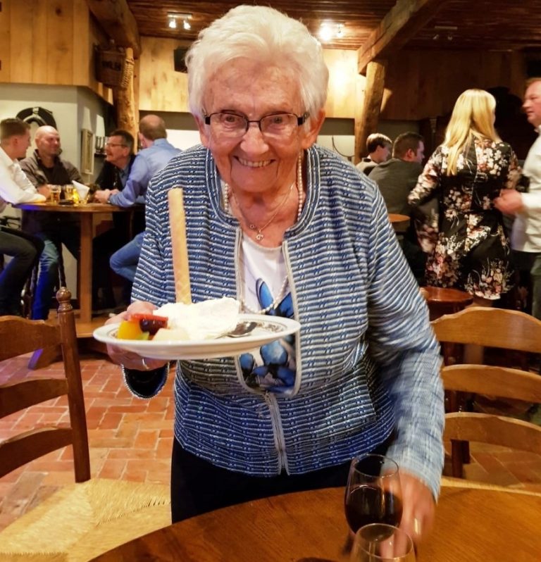 ‘Hallo, onze buurvrouw Annie Mensink uit de Bekkampstraat viert vandaag haar 90e verjaardag. We vieren het bij Herberg de Gebrande Waateren. En het is een topfeestje!’