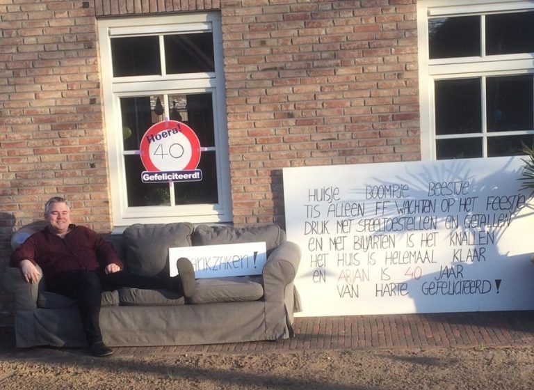 Arjan van Til, woonachtig in zijn nieuwe huis aan de Diepenheimsestraat, wordt morgen 40 jaar. Hoewel het feest nog even op zich moet laten wachten, kreeg hij van vrienden en familie een mooi bord én bank voor de bankzaken in de tuin. Ook namens de redactie van harte proficat!