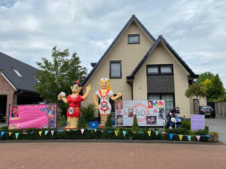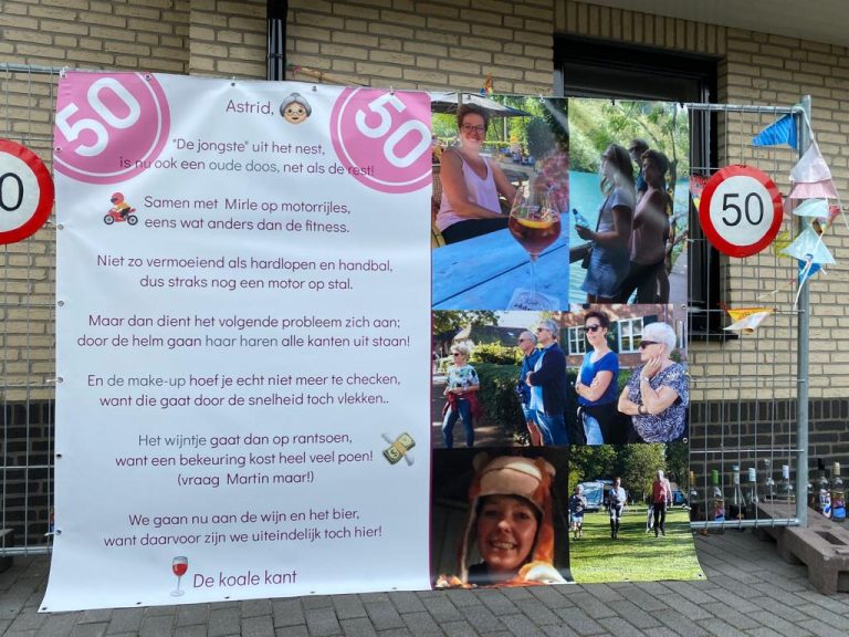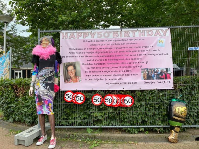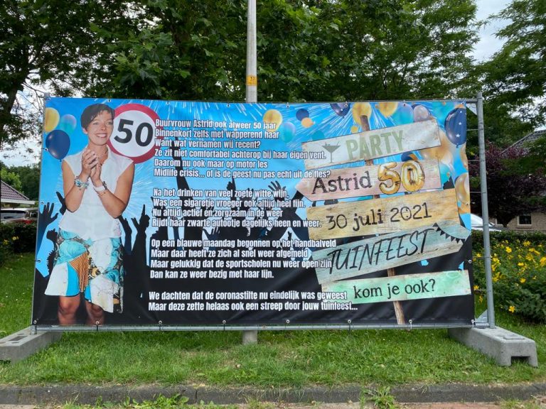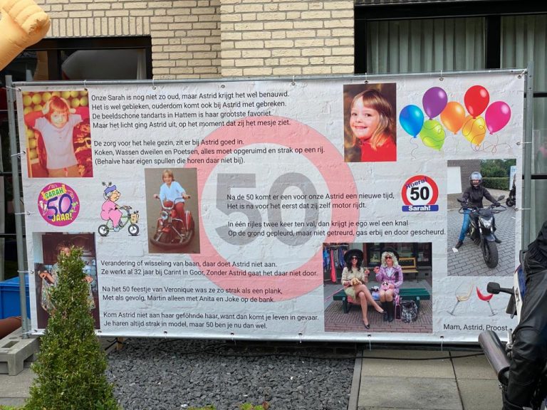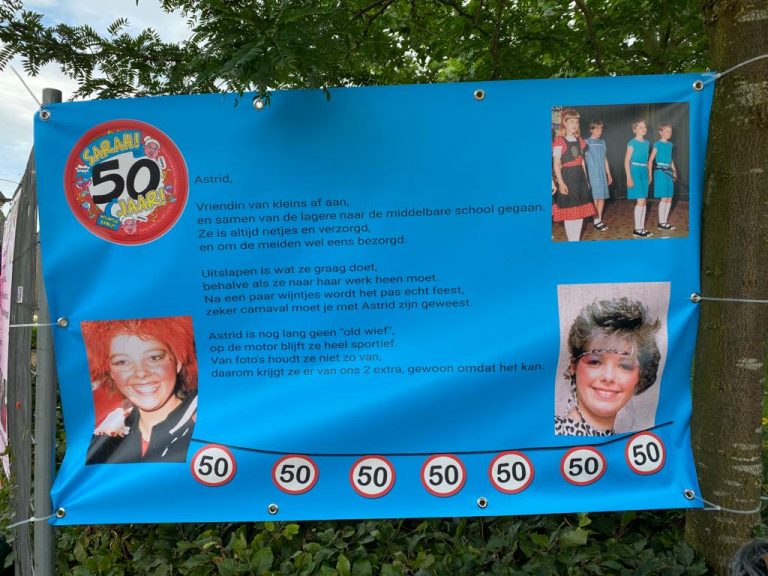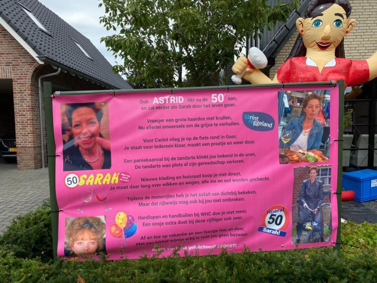 Astrid ten Thije o/g Boonkkamp, woonachtig aan De Klomp in Hengevelde, is 50 jaar geworden. En als je over De Klomp heen fietst, kan je dit niet ontgaan. Vele borden en Sarah’s sieren de voortuin. Ook namens de redactie van harte proficiat! Hieronder foto’s van de spandoeken: