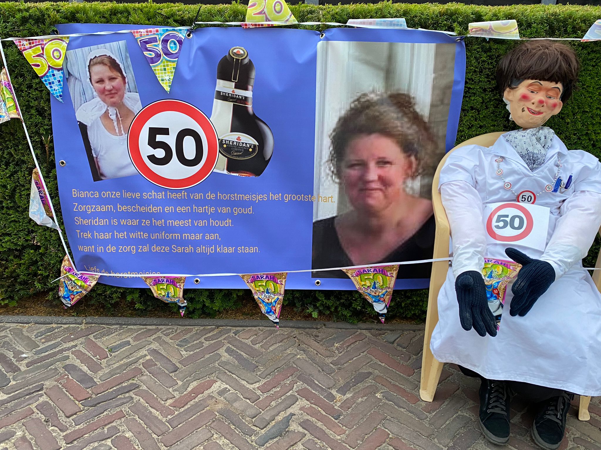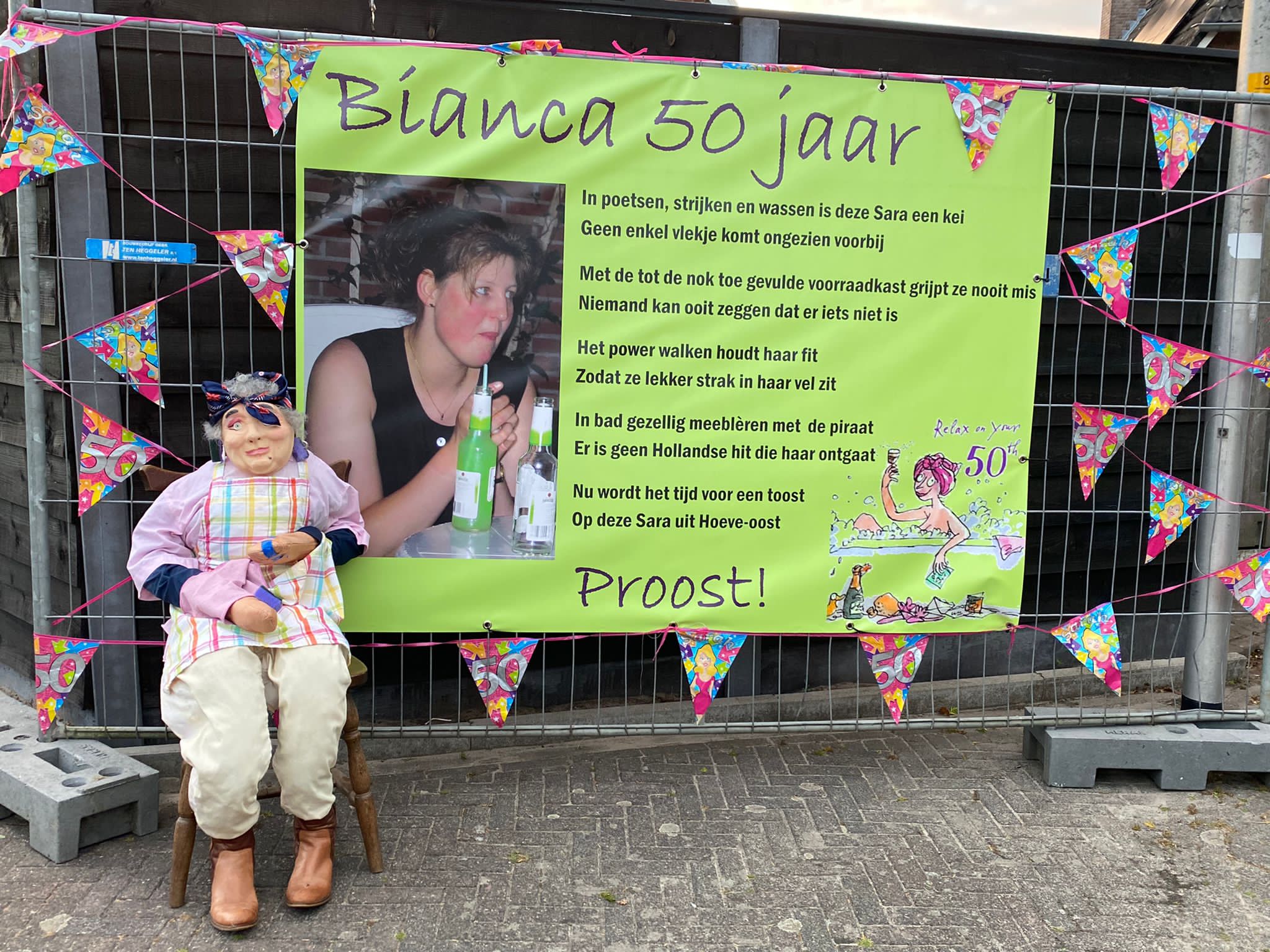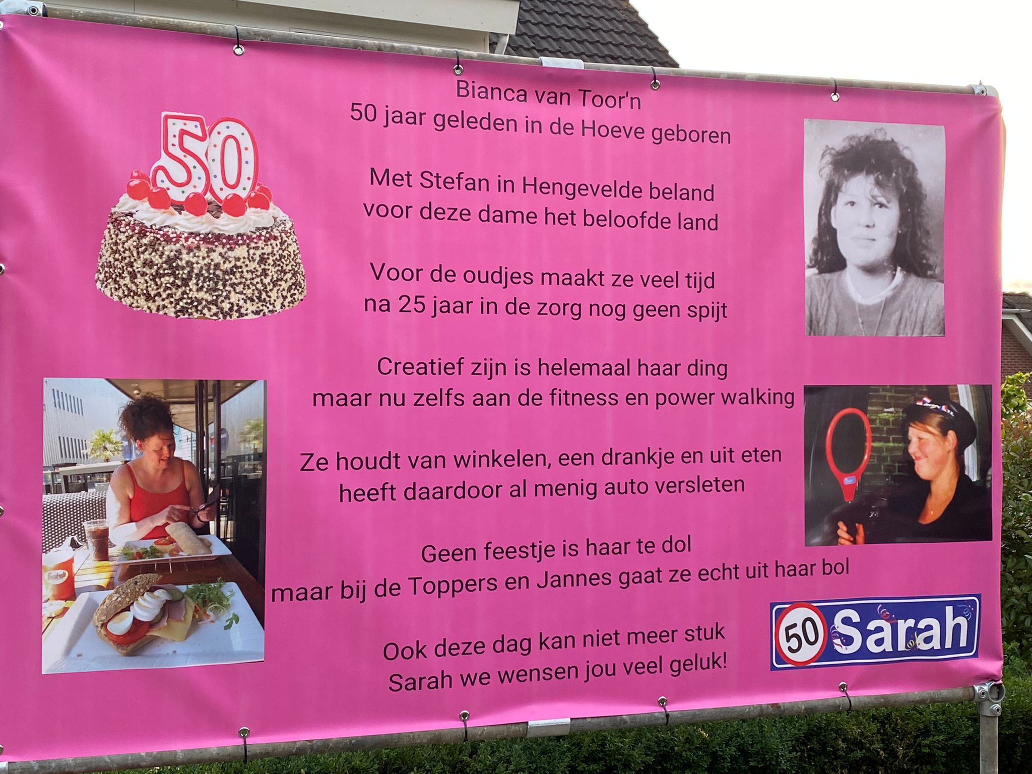 Bianca Mentink heeft dan toch de respectabele leeftijd van 50 jaar bereikt! Dat heeft zij, maar ook de buren geweten! De borden stonden daadwerkelijk overal!