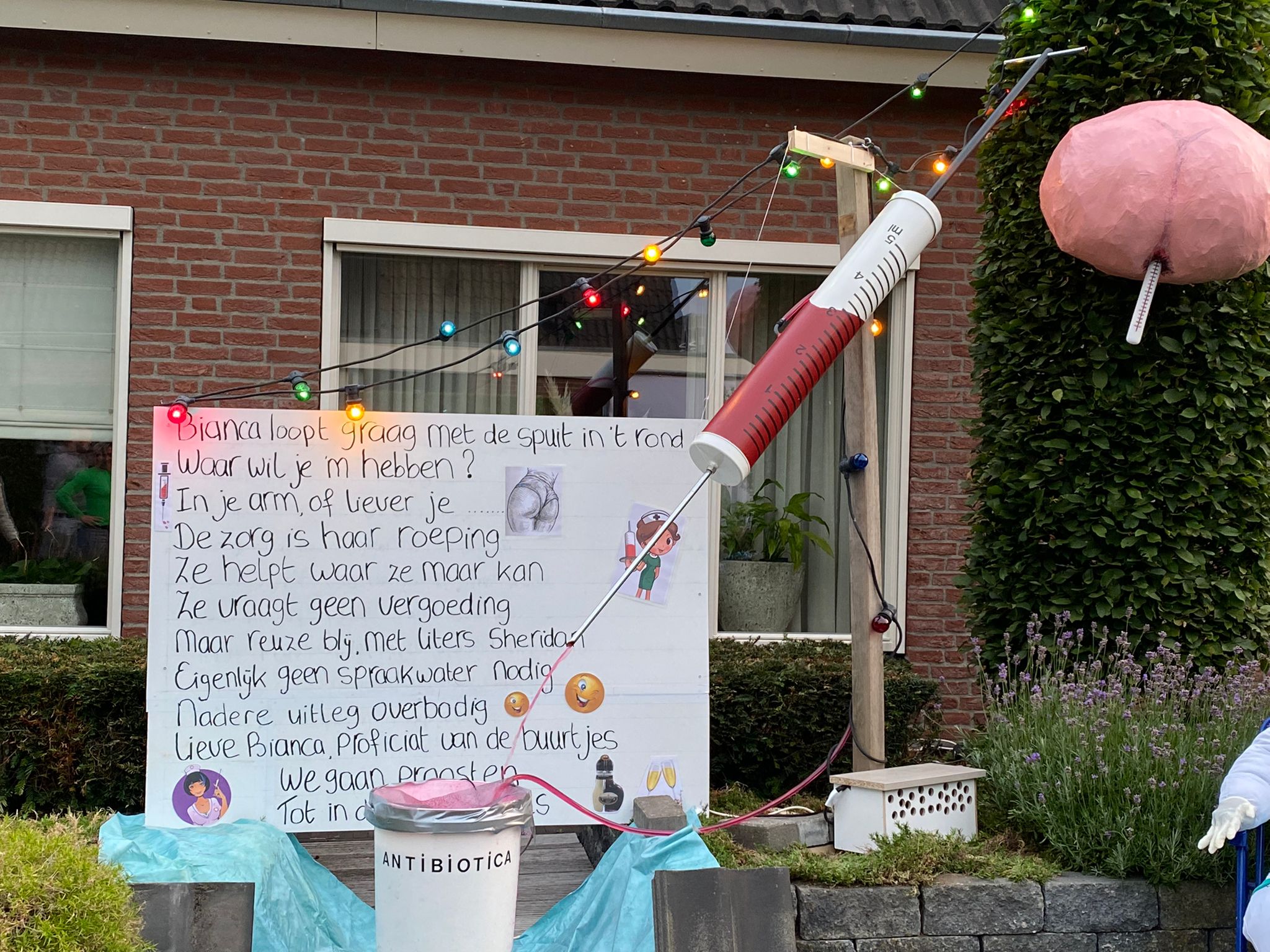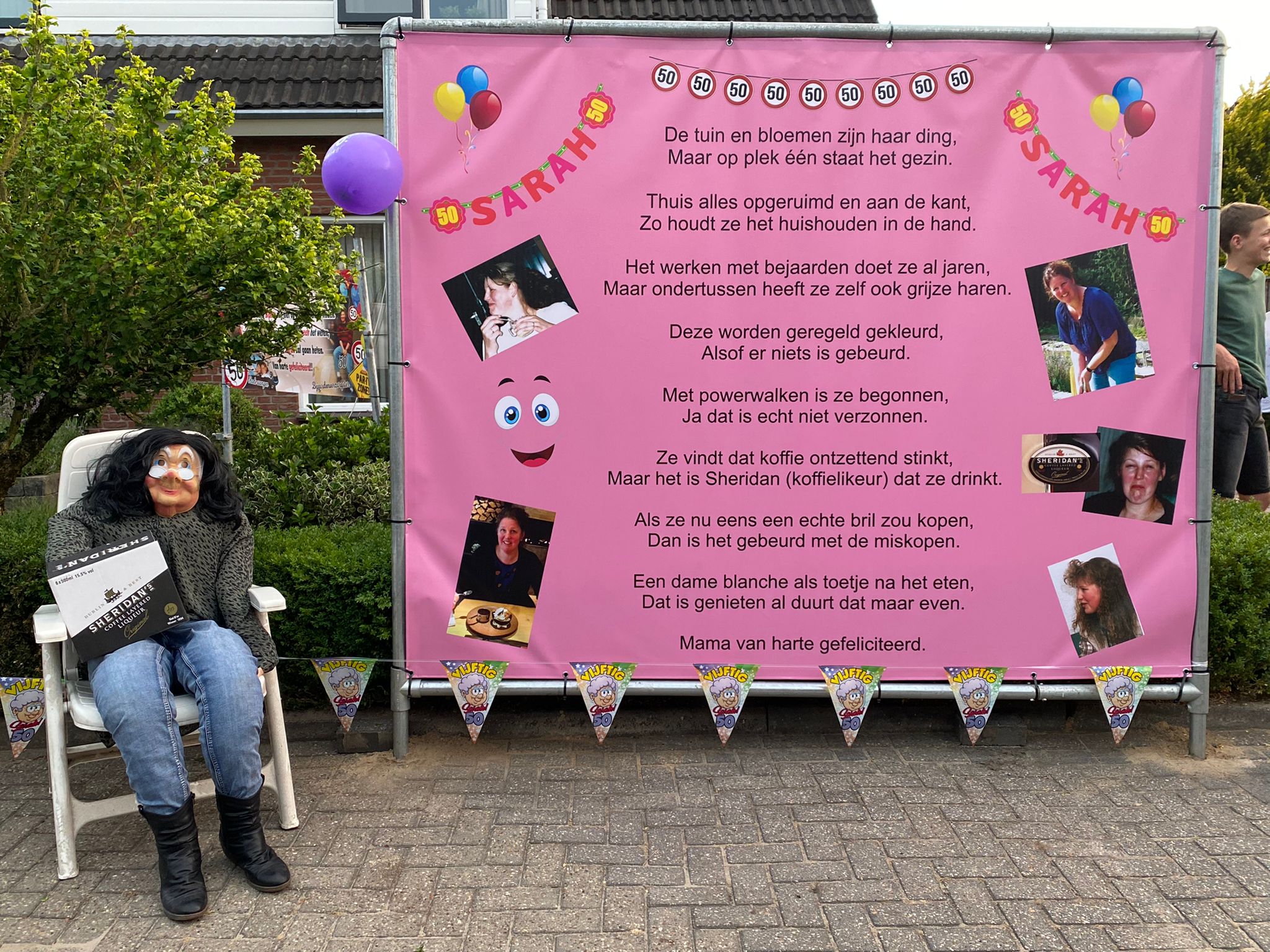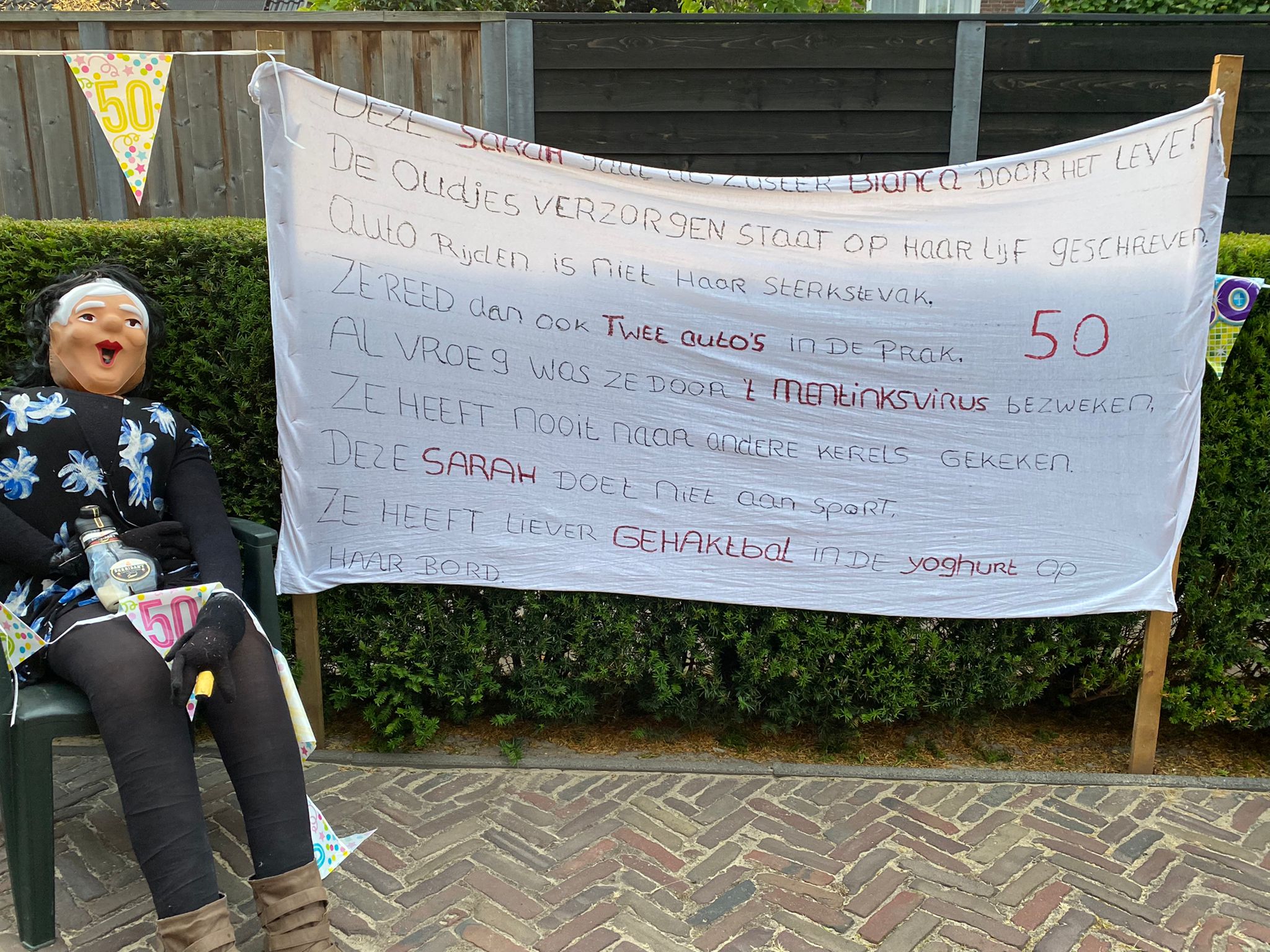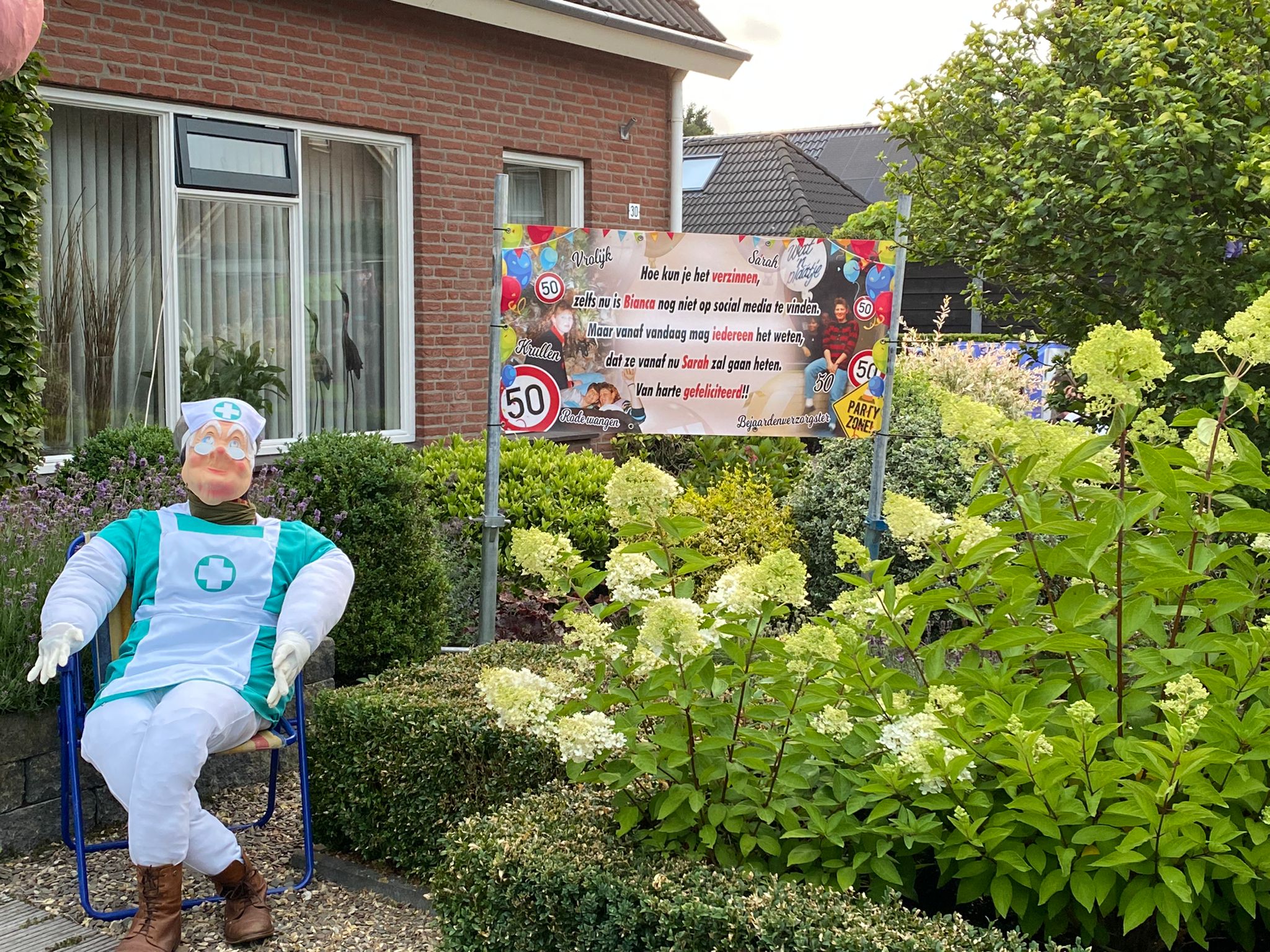 Bianca Mentink heeft dan toch de respectabele leeftijd van 50 jaar bereikt! Dat heeft zij, maar ook de buren geweten! De borden stonden daadwerkelijk overal!