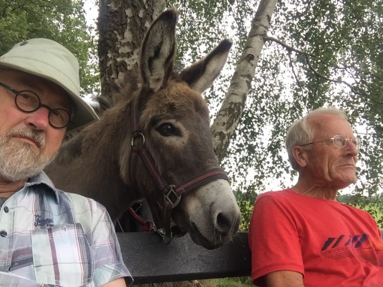 Gisteren plaatsten we een bericht (klik hier) over twee bijzondere passanten, die met een ezel door Hengevelde wandelden. Oplettende Hengeveldenaren brachten het volgende verhaal bij de redactie over de opvallende tocht van enkele heren. "Wij Harm Jan, Bert en Roel maken jaarlijks een wandeling van drie of vier dagen door de Achterhoek en Twente. We hebben geen vaste bestemming. Het enige dat we weten is dat we alle drie na twintig tot vijfentwintig kilometer vinden dat we lang genoeg gewandeld hebben. En dat het dus tijd is voor een overnachtingsplek. We hebben in al die jaren op de meest bijzondere plaatsen overnacht, van plekjes in het bos tot een naturistencamping. Op boerencampings zijn we altijd welkom; de gasten willen Harm Jan altijd fotograferen. En de kinderen willen hem aaien. We hebben veel mooie ontmoetingen met mensen onderweg. Bij passerende fietsers en automobilisten laten we een spoor van glimlachen achter. Nou ja, Harm Jan dan. Harm Jan is de pakezel van ons drieën. Hij draagt alles wat nodig is voor kamperen en wandelen met mooi en slecht weer. Harm Jan is de minst kieskeurige van het drietal. Zijn kostje scharrelt hij bij elkaar in de berm. Drinken doet hij als het hem uitkomt. Één keer per dag een halve emmer water is genoeg. Dit jaar gaat de tocht vanuit Eibergen richting Neede, Diepenheim en Hengevelde. Gelukkig hebben Twente en de Achterhoek veel toeristische fiets- en wandelpaden; die zijn het mooist. Harm Jan loopt dan los achter ons aan. Hij haalt ons wel weer in als hij wat langer over een lekker hapje weegbree doet."
