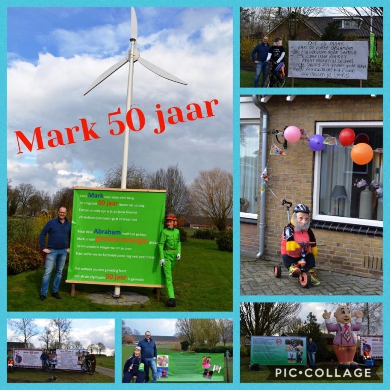 Mark Schreijer viert vandaag zijn 50e verjaardag. Gisteravond heeft hij aan de Bentelosestraat diverse doeken in zijn tuin gekregen, waaronder een van de boogjesbuurt.