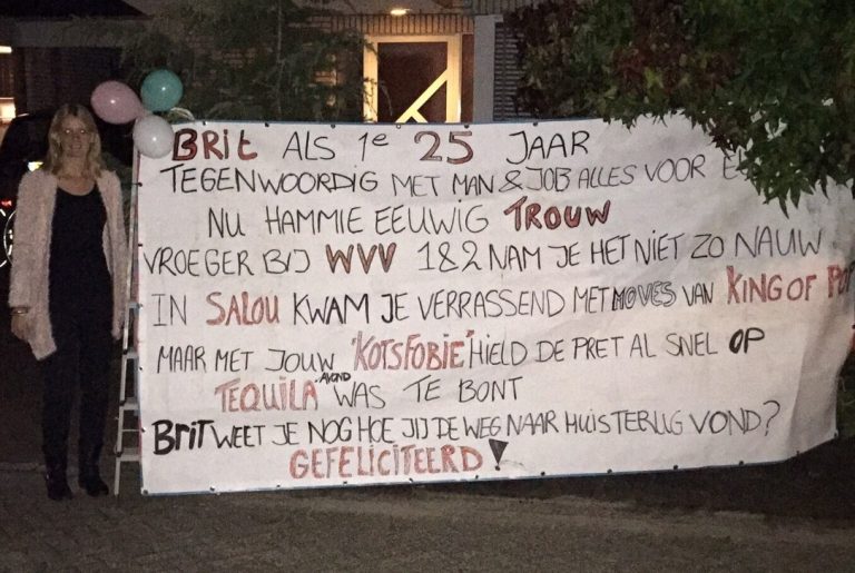 Brit de Witte, woonachtig aan de Van de Brinkstraat, heeft haar symbolische halve Sarah ontvangen en dat hebben wij als vriendinnen niet onder stoelen of banken gestoken gezien de bovenstaande tekst! Namens je vriendinnen nogmaals proficiat!