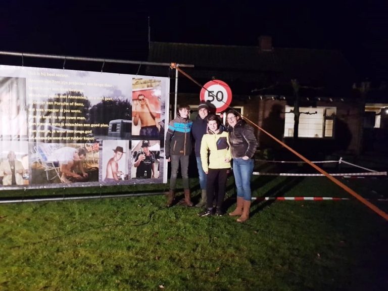 Tom Zwienenberg, bekend van de lach en MHZ heeft Abraham gezien! Een van de vrienden deed een uitspraak in de trant van: ’Er moest trouwens een extra groot doek zijn anders paste alle tekst er niet op!”