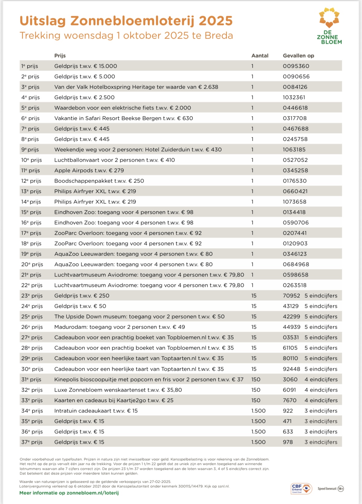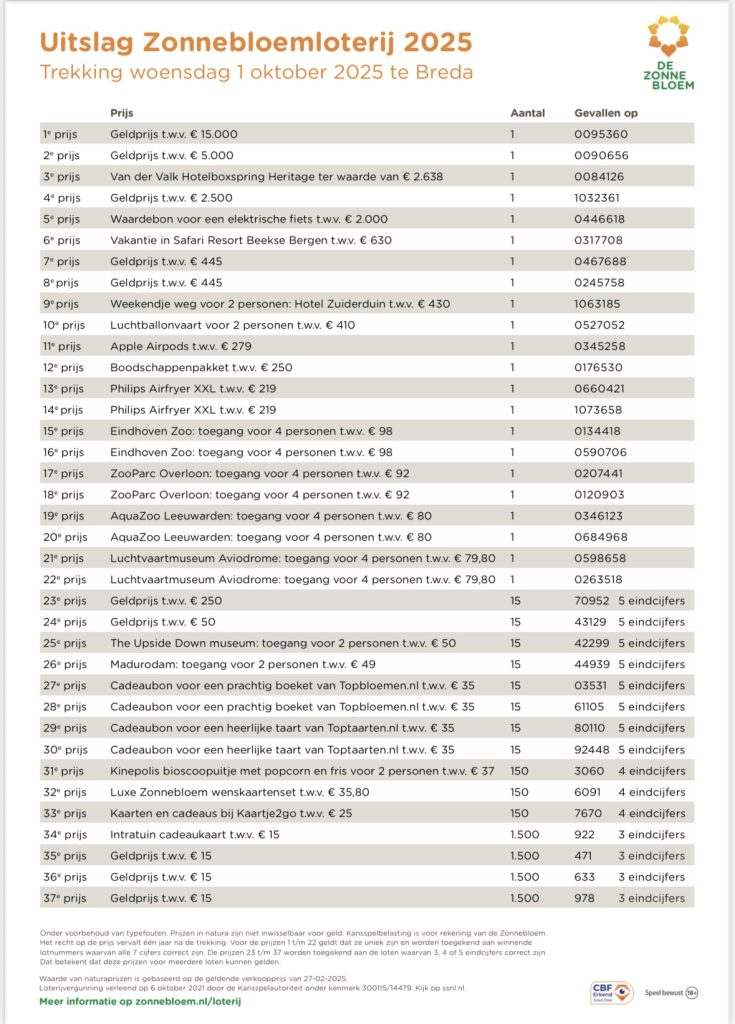 U hebt afgelopen zomer met velen de Zonnebloemafdeling Hengevelde-Isidorushoeve gesteund door loten te kopen, waardoor wij met onze vrijwilligers weer mooie activiteiten kunnen organiseren voor onze deelnemers. Landelijk zijn er door vrijwilligers en digitaal 667.745 loten verkocht, waarvan in onze afdeling 1.755 loten à € 2,25 voor onze afdeling. Heel erg bedankt hiervoor. Laat ons weten als u een mooie prijs hebt gewonnen. Op zonnebloem.nl kunt u gemakkelijk vinden of u prijs hebt, en in de bijlage bij dit artikel vindt u de trekkingslijst.